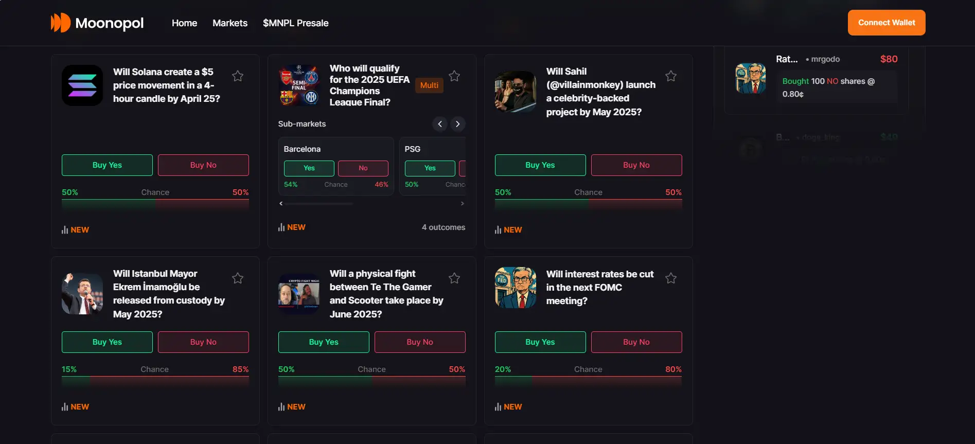 Markets on Moonopol are fueled by speculation around culturally relevant and highly volatile subjects — whether it’s a crypto influencer launching a token, Bitcoin reaching a new milestone, or geopolitical news. Users engage with Yes/No or multi-outcome questions, placing bets with USDC. Every transaction is processed through audited smart contracts, ensuring instant, fair, and irreversible outcomes. The dynamic pricing system adjusts odds in real-time based on market demand, creating an experience that blends trading and gaming.