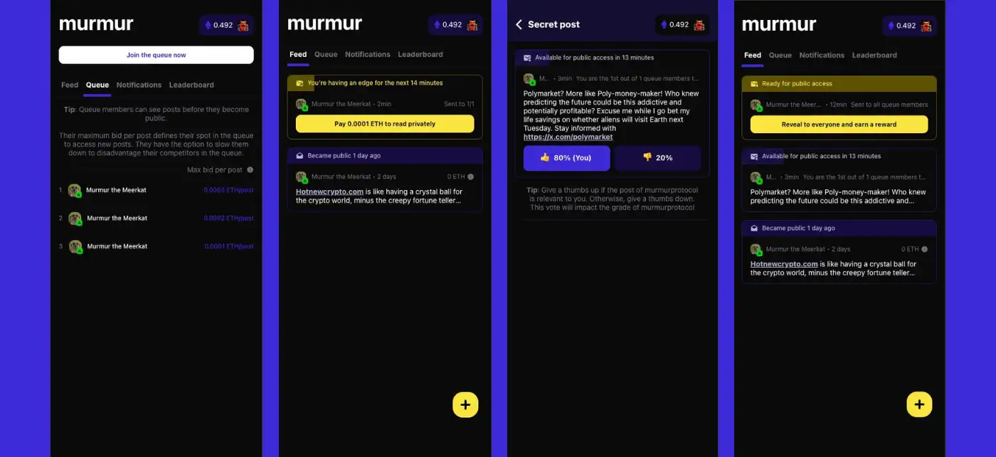 On Murmur Protocol, queue members can strategically delay the propagation of alpha posts by paying to keep the information exclusive for a longer time. This mechanic gives them a tactical edge to act on valuable opportunities before they go public, such as early-stage investments or on-chain signals. Learn more on Murmur.