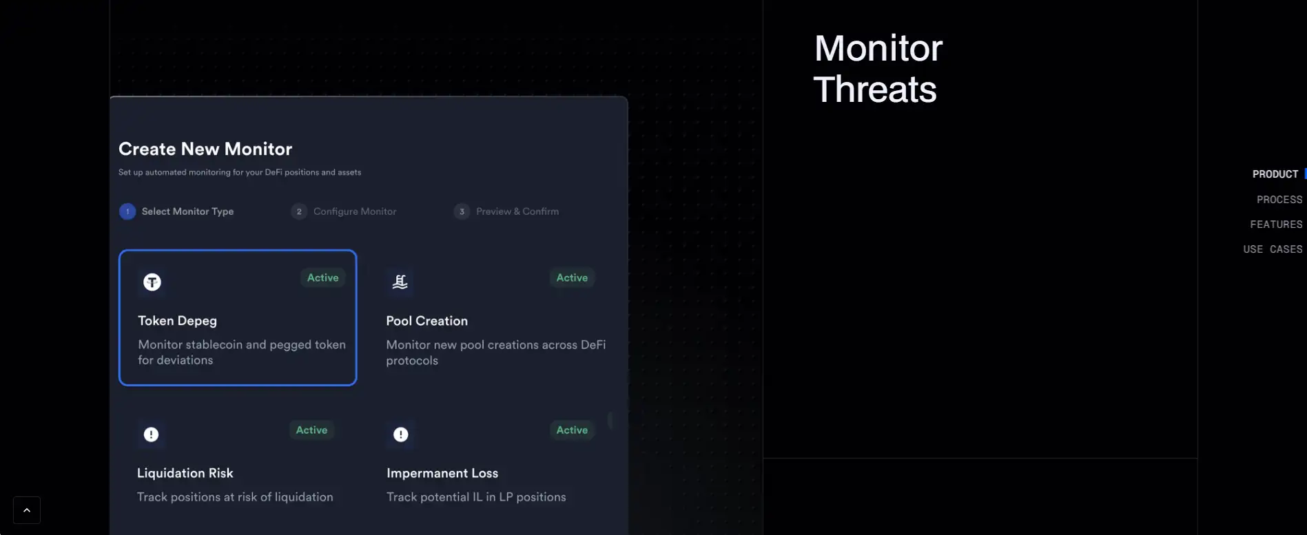 - Live Threat Detection: Receive instant alerts for protocol exploits, wallet vulnerabilities, depegs, or unusual contract activity across chains.