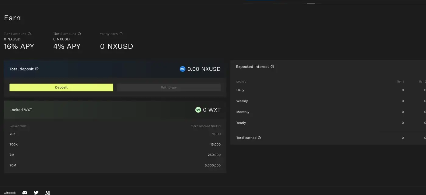 - Staking: To earn attractive APYs, stake NXUSD or Curve LP tokens. Access the staking section, select your preferred staking option, and follow the instructions to start earning rewards.