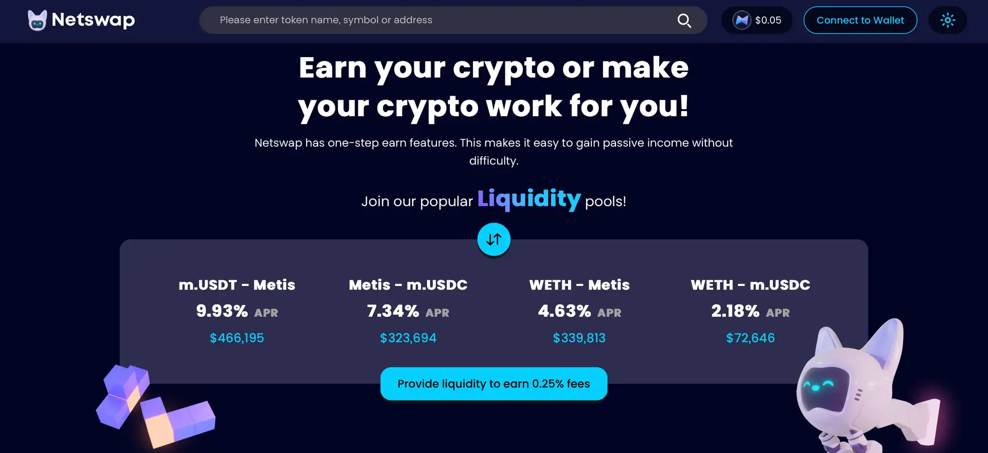 Netswap is a decentralized exchange platform built exclusively for the Metis Andromeda Layer 2 network, delivering lightning-fast, low-cost, and secure DeFi trading. As the first native DEX on Metis, Netswap positions itself as the premier platform for users to swap tokens, earn yield, stake crypto, and participate in IDOs with ease.