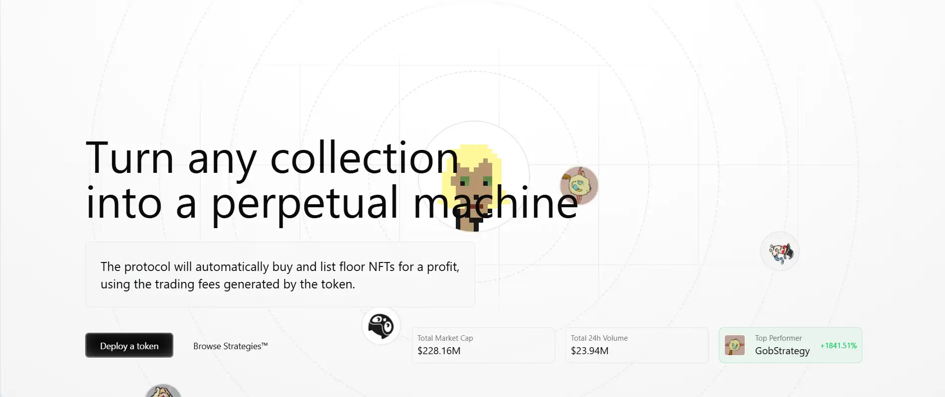 - Deploy a Strategy™ Token: If you own or support an NFT collection, you can launch a tokenized trading strategy that automatically interacts with the collection’s floor price and generates yield.