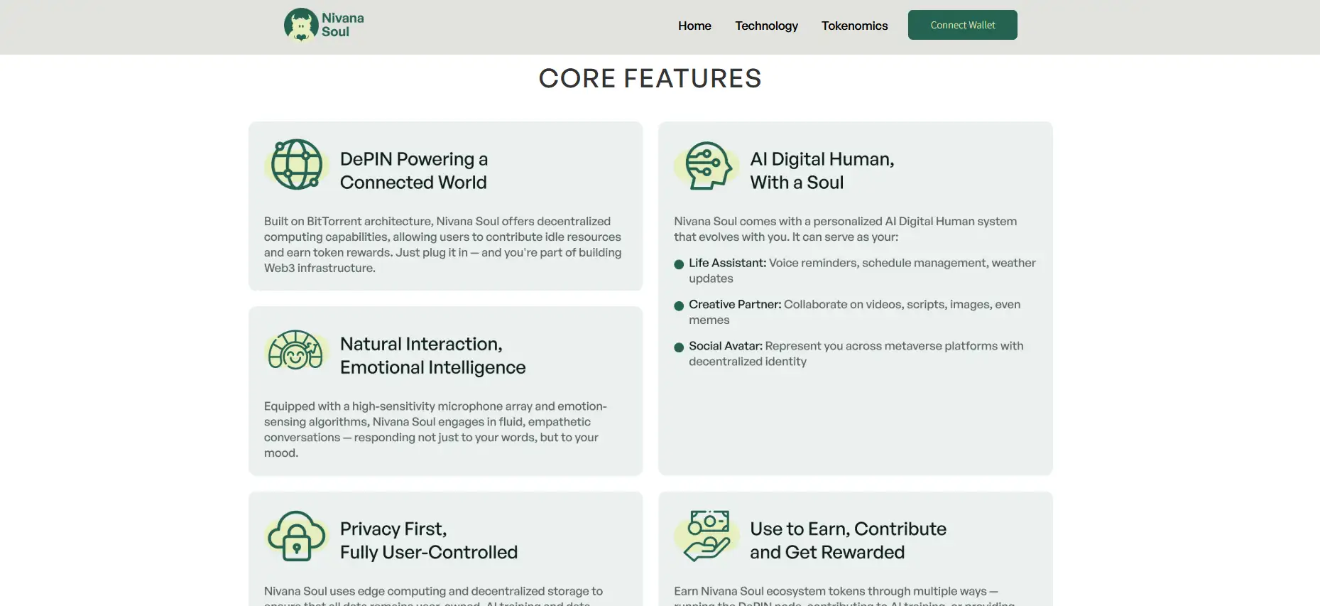 Nivana Soul is building a comprehensive Web3 ecosystem that fuses AI digital humans with the robustness of DePIN infrastructure. The project addresses the limitations of traditional AI systems—such as high cloud computing costs and centralized control—by integrating a decentralized compute layer based on the BitTorrent P2P network. This design allows AI agents to operate at scale, more securely, and with reduced latency, opening new doors for small developers and creators to innovate without needing expensive centralized infrastructure.