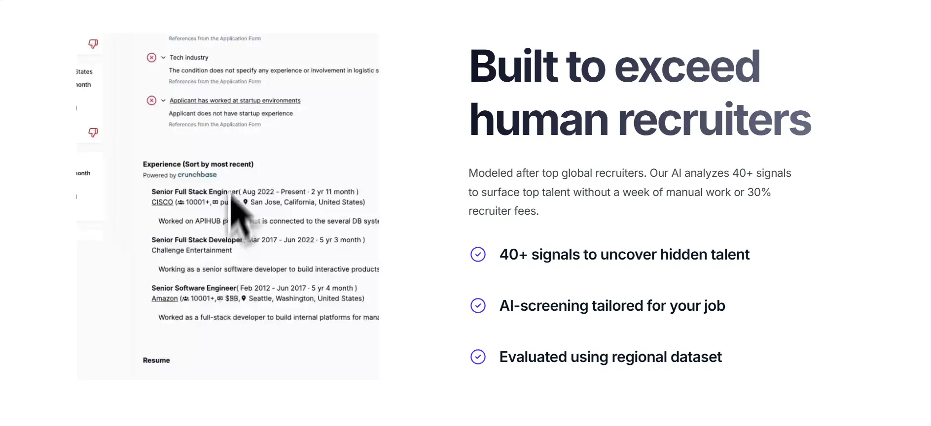 - Supported Roles: Hire across Engineering (Frontend, Backend, Fullstack, DevOps, AI/ML), Marketing (Growth, Product, SEO), and Sales (SDRs, AEs, Biz Dev).
