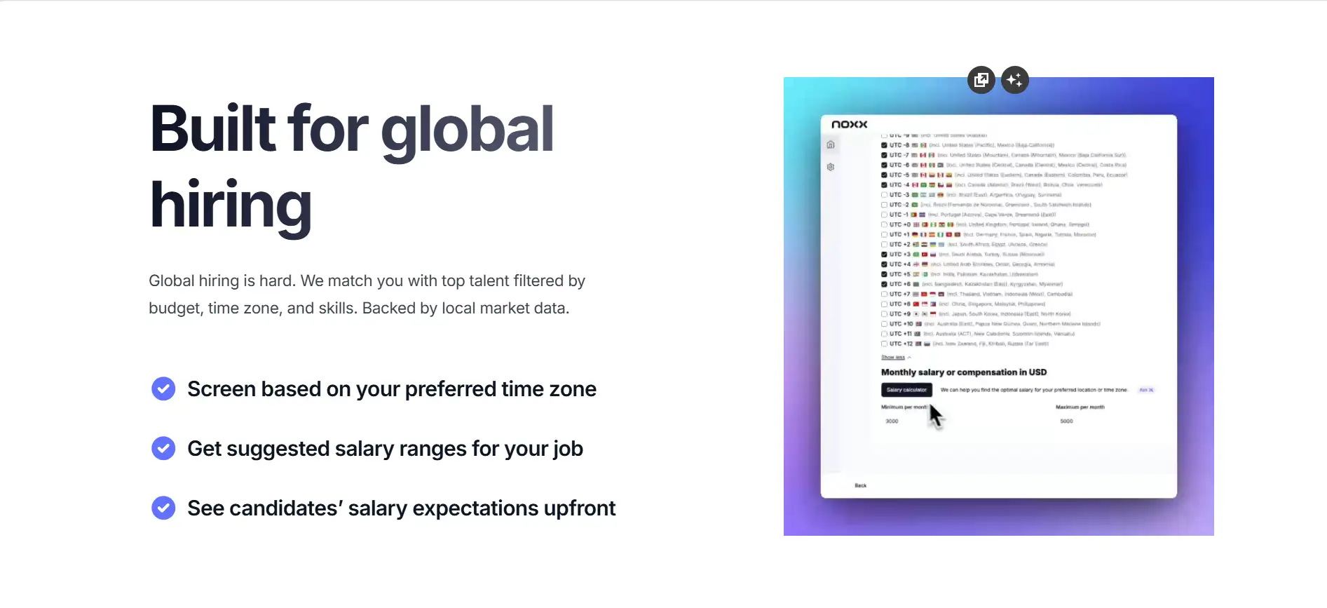 Noxx is designed for global remote hiring, and filters candidates based on preferred time zones, communication styles, and budget. By analyzing regional data alongside your job post, Noxx ensures that the top 10 candidates you receive are not only skilled but also aligned with your team's location and culture.