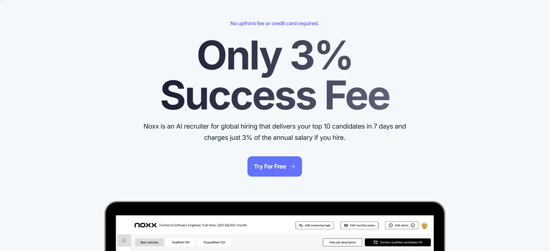 - 3% Success Fee: Pay only when you hire, and never more than 3% of the candidate’s annual salary—compared to the industry-standard 20–30%.