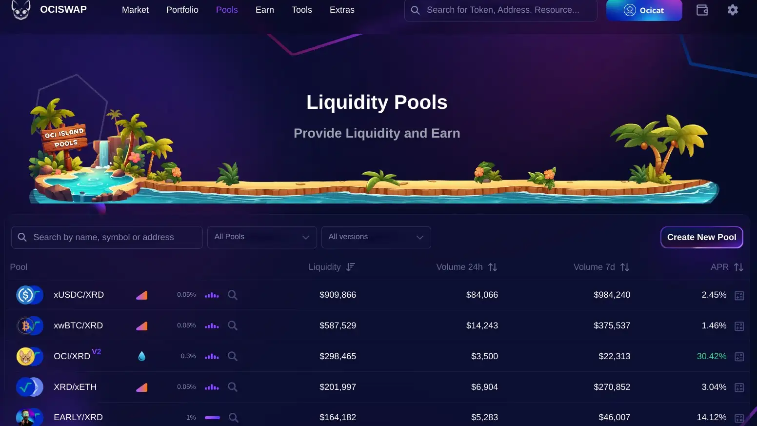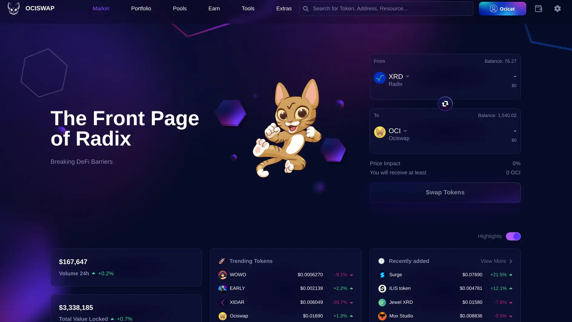 - Visit the Ociswap Website: Go to the official Ociswap website and connect your Radix Wallet to access trading, liquidity pools, and governance features.