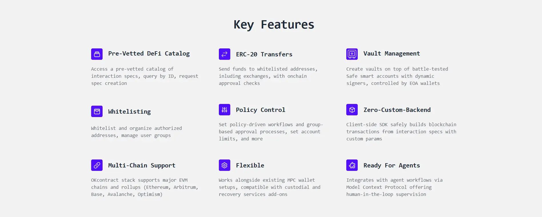 With built-in support for EVM and non-EVM chains, auto-generated UI components, and developer-focused SDKs, OKcontract eliminates the overhead of manual blockchain integration. Its approach is secure, composable, and scalable—ideal for developers, dApps, tooling platforms, and AI-driven agents needing reliable and consistent interaction logic across protocols.