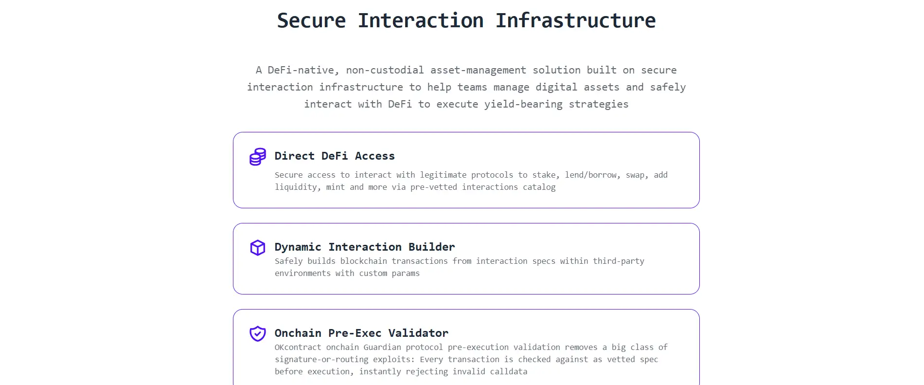 AI agents require structured, verifiable data to execute transactions reliably. OKcontract provides AI-ready specifications for smart contract interactions, reducing the risk of misidentification, hallucination, or code injection. The interaction catalog acts as a trusted reference layer that AI systems can call upon for safe execution across protocols.