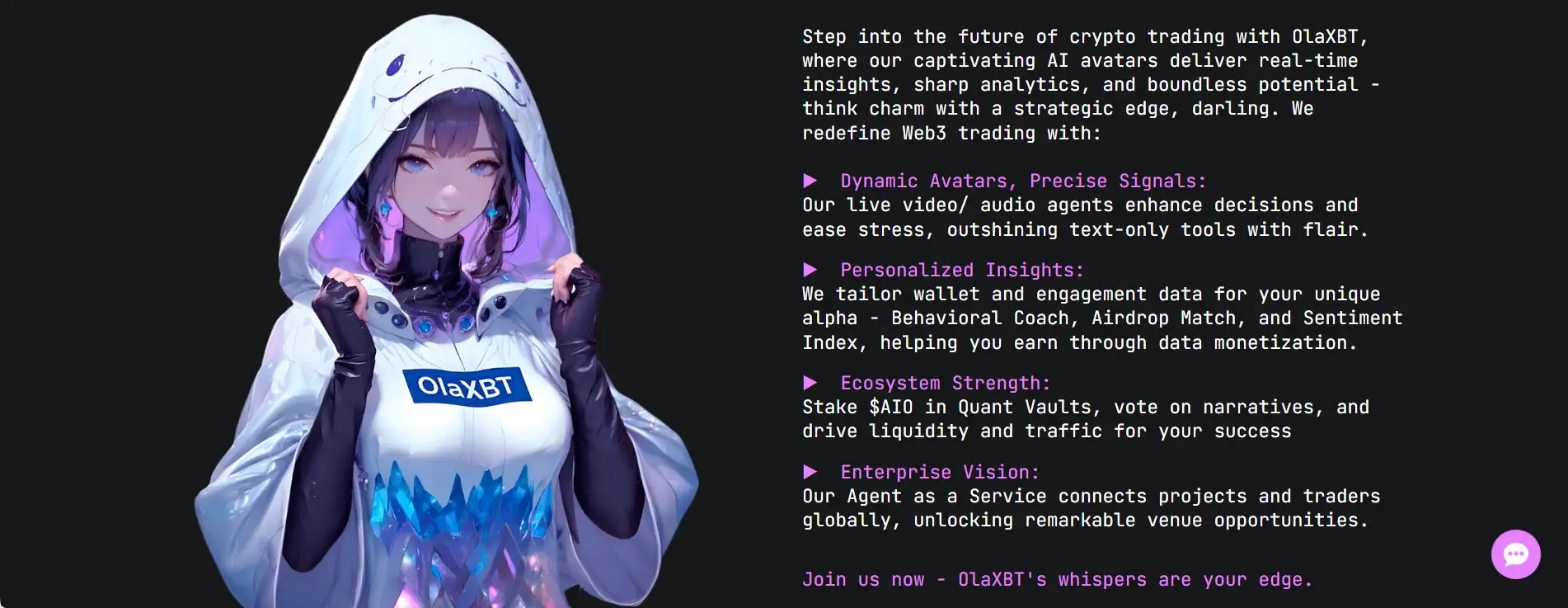 OlaXBT is a decentralized AI-powered crypto trading platform designed to make alpha discovery, market prediction, and strategy execution intuitive and profitable for Web3 users. By blending AI avatars, on-chain data analysis, and a tiered agent system, OlaXBT offers a gamified, data-rich trading experience that feels like having a 24/7 quant analyst at your side.