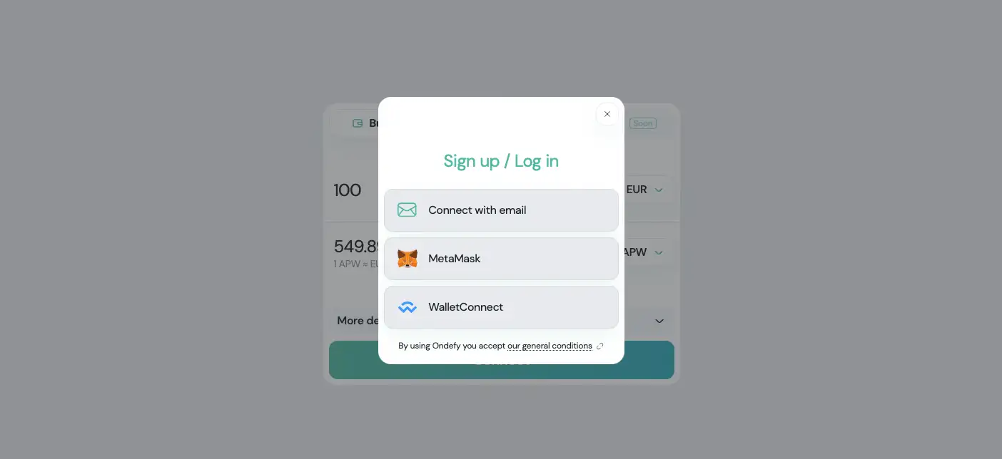 - Sign Up or Connect a Wallet: You have the option to sign up using your email address or connect an existing crypto wallet. Ondefy supports a variety of popular wallets, including MetaMask, Trust Wallet, and others. If you don’t have a wallet yet, you can create one directly through the platform.