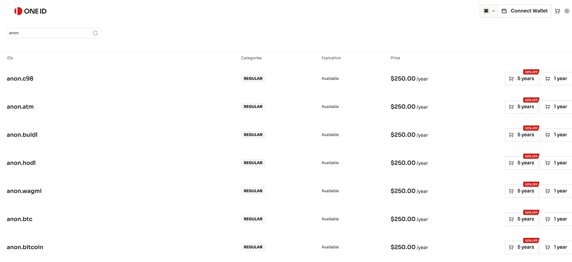 OneID distinguishes itself from other identity solutions through its extensive support for various decentralized identities (DIDs). Unlike domain name services, which primarily focus on assigning domain names, OneID provides a holistic identity solution that encompasses various aspects of digital identity management. Users can select from a wide array of ID names, including .c98, .btc, .crypto, and many others, to best represent their digital presence.