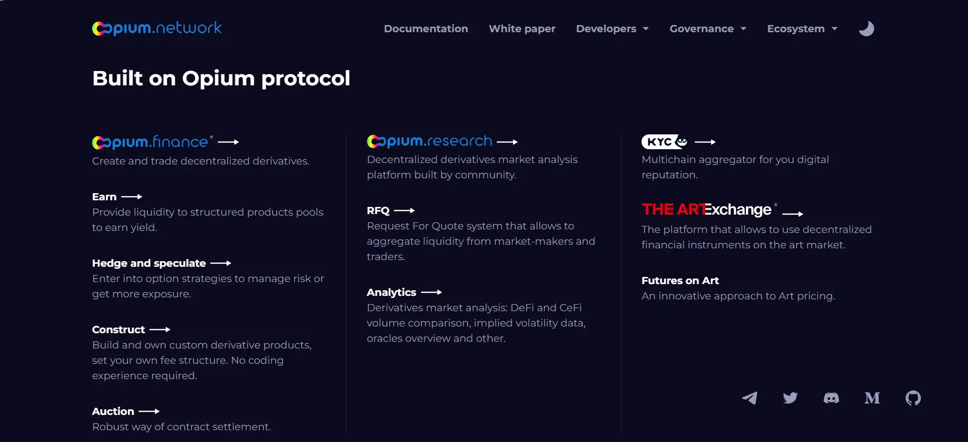 - Join the Community: Share your expertise or ideas, apply for grants, or become a contributor to projects built on Opium Protocol.