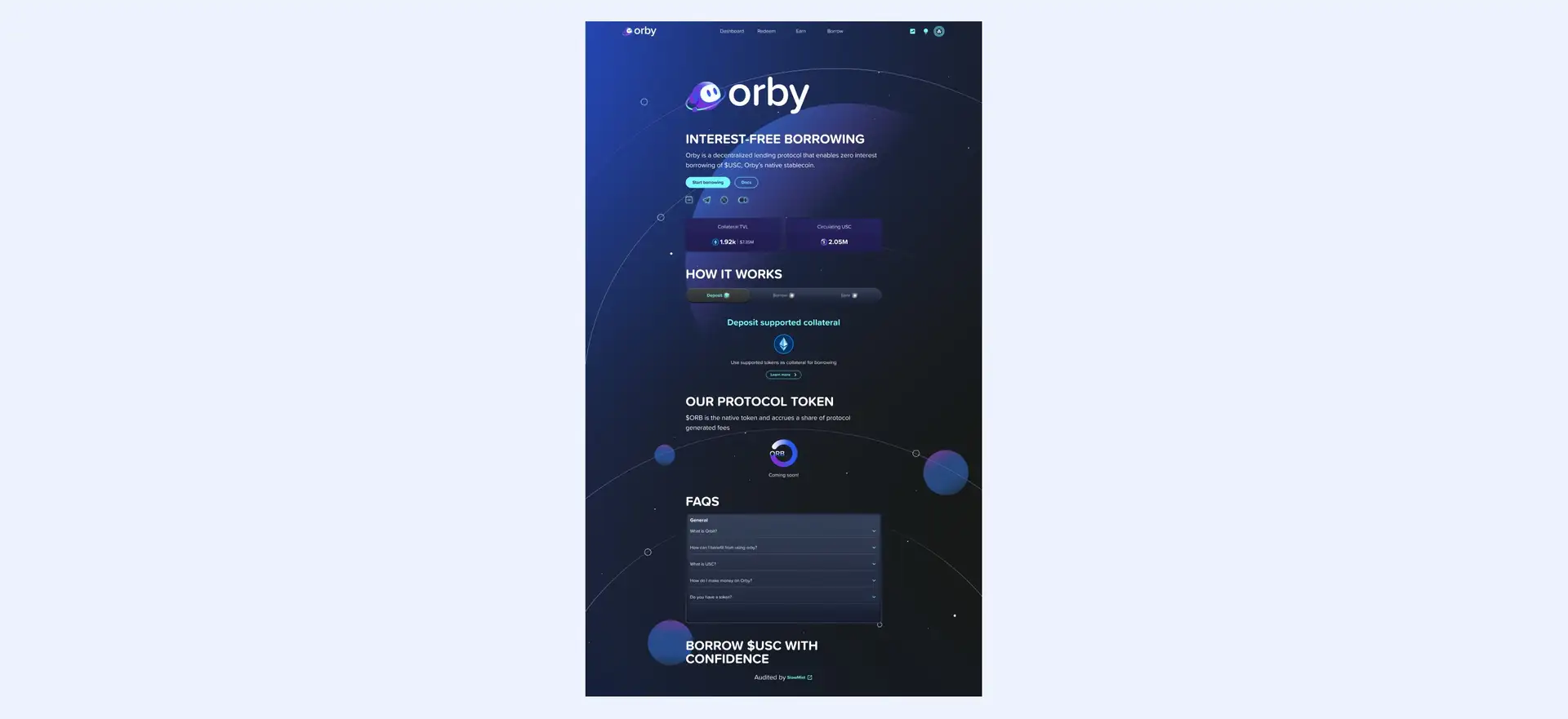 Orby Network is a decentralized lending protocol that offers interest-free loans using its native stablecoin, USC. The project aims to empower users by enabling them to unlock asset productivity without liquidating their holdings. Orby Network users can participate in liquidations and earn through various mechanisms within the ecosystem. The project focuses on security, transparency, and maintaining the stability of its stablecoin, making it a significant player in the decentralized finance (DeFi) space. By leveraging overcollateralization, Orby ensures that users can mint USC against their deposited assets while maintaining the value of their collateral.
