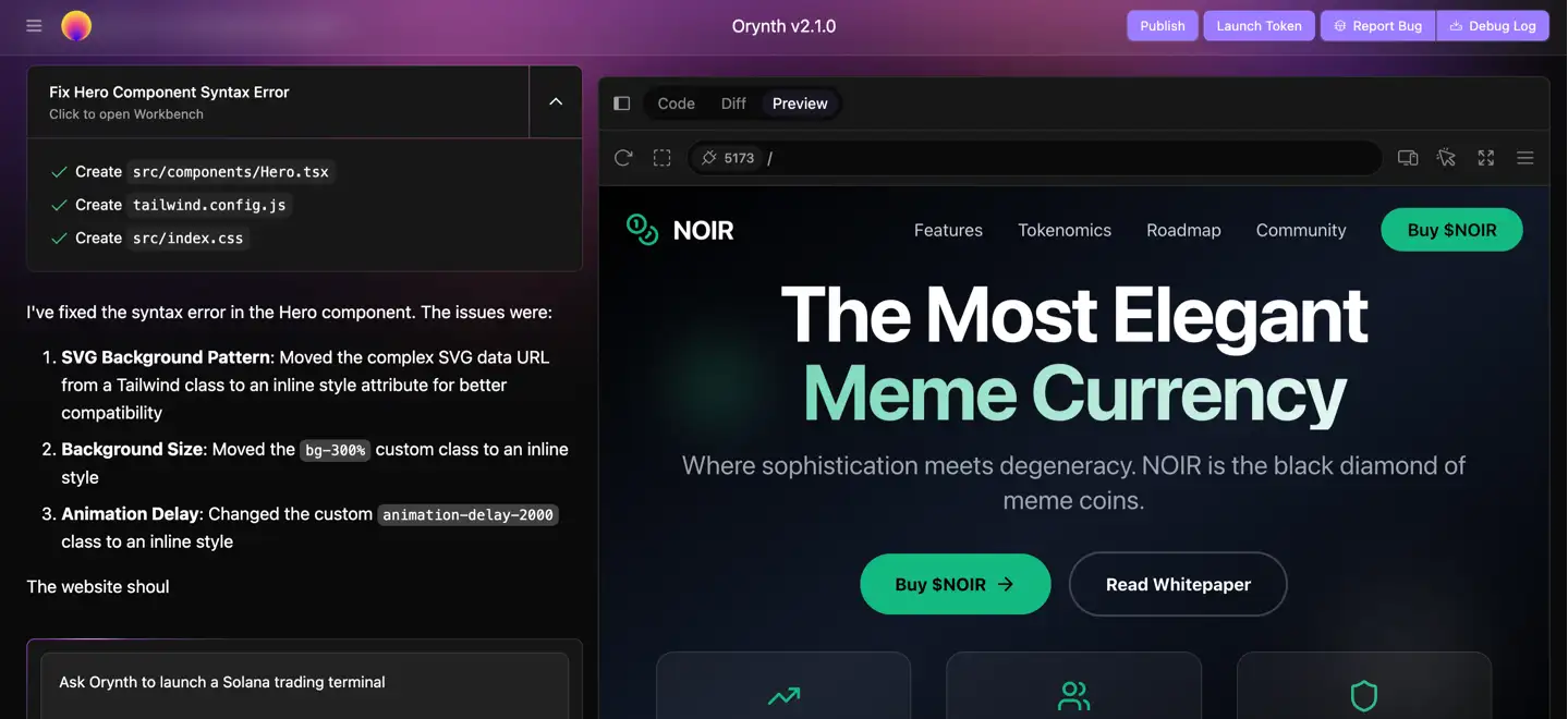 Orynth is an AI-powered no code platform that makes building on Solana as simple as describing an idea. Anyone can turn a prompt into a fully functional blockchain application in minutes without writing code or dealing with blockchain complexity.