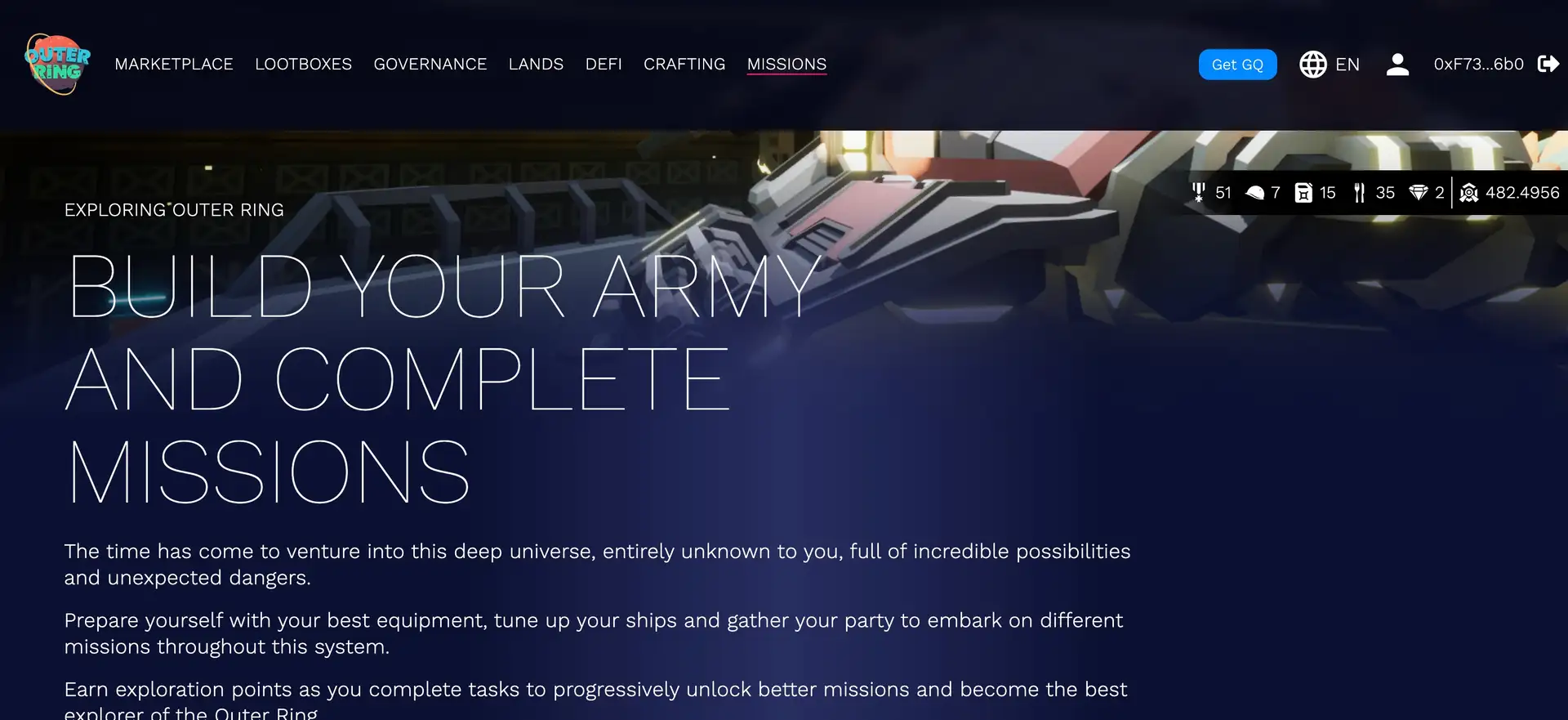 Outer Ring MMO is an expansive science-fiction MMO that introduces a new era of decentralized gaming through its unique integration of blockchain technology. It transports players into a detailed universe filled with planets, factions, and mysteries, where they can interact with other players, engage in battles, explore rich landscapes, and partake in a self-sustaining economy. At the heart of Outer Ring is its GQ token, a cryptocurrency that fuels all in-game transactions, enabling players to buy, sell, and trade assets and services.
