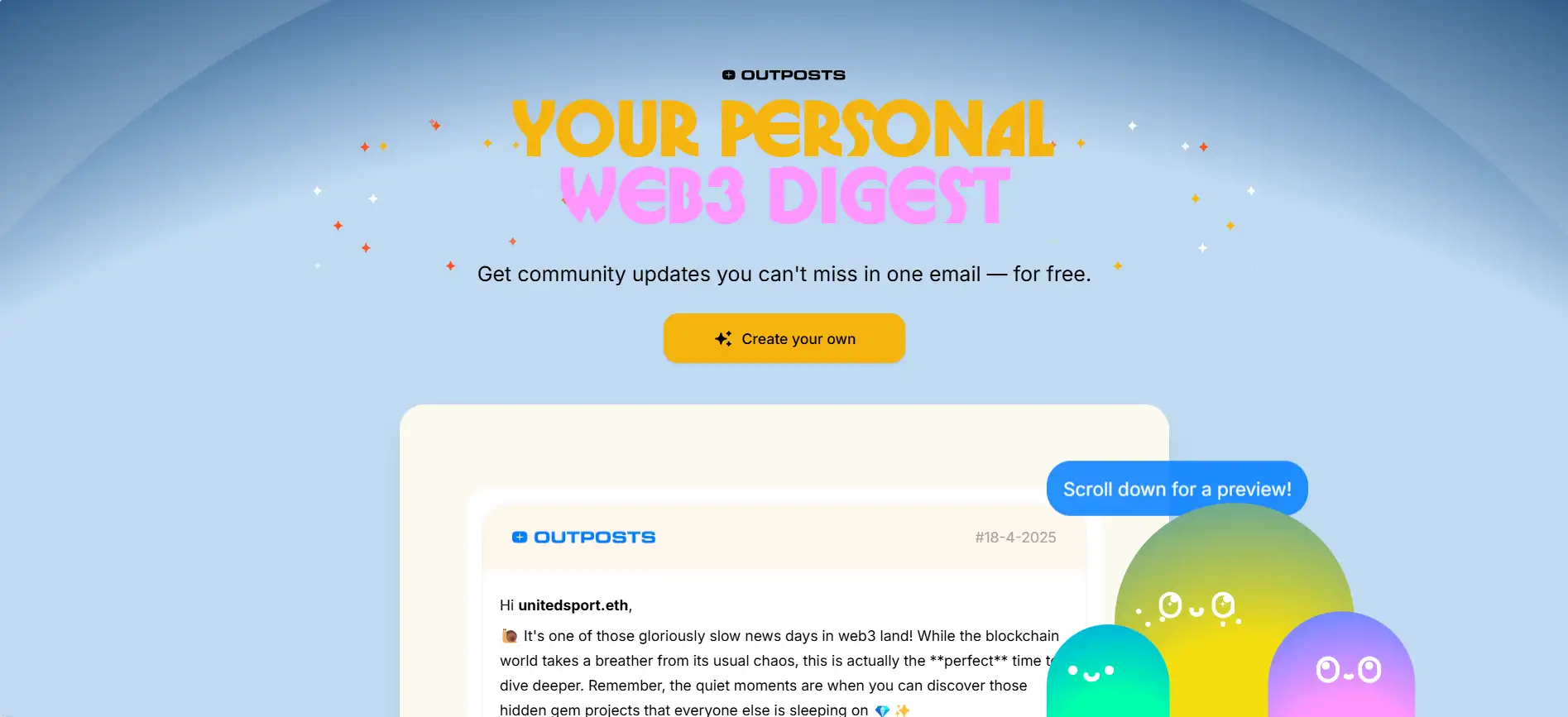 Outposts is a personalized Web3 newsletter platform that delivers curated, community-focused updates from across the decentralized ecosystem. Built to save users from endless scrolling through Twitter threads, Discord chats, and Substack posts, Outposts compiles the most relevant and timely content into a twice-weekly digest delivered straight to your inbox. It offers Web3-native users a powerful way to stay informed without the noise.