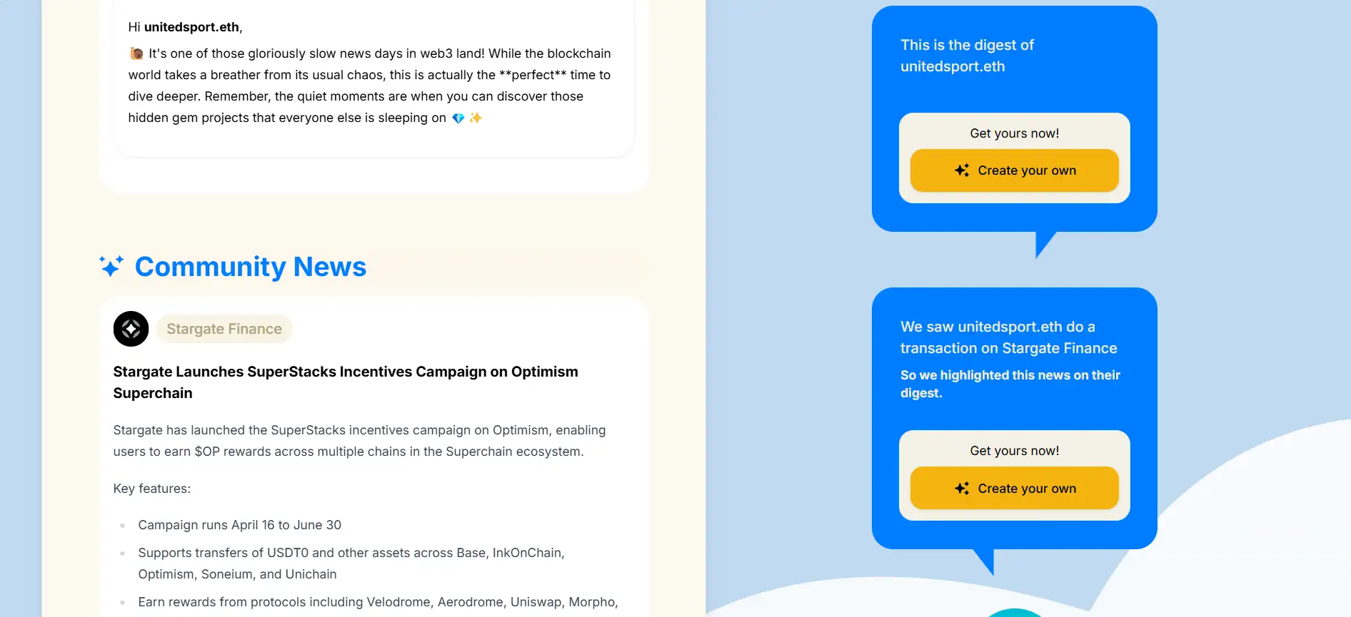 Outposts isn’t just another newsletter—it's a fully personalized Web3 digest based on your on-chain activity. Instead of delivering the same headlines to every reader, Outposts curates content from Discord, Twitter/X, Mirror, Substack, and more, aligned with the projects and communities that match your wallet behavior. This ensures every email contains news that’s actually relevant to your Web3 journey.