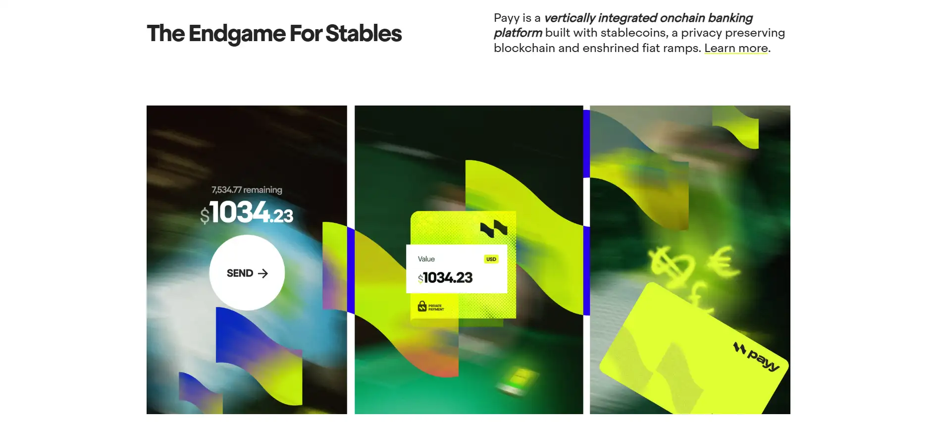 Payy is a stablecoin-native banking platform designed for those who value privacy, security, and freedom in financial transactions. Operating at the intersection of compliant privacy tech and decentralized finance, Payy enables users to send, receive, and spend stablecoins with zero fees, no gas, and without exposing their transaction history to the world.