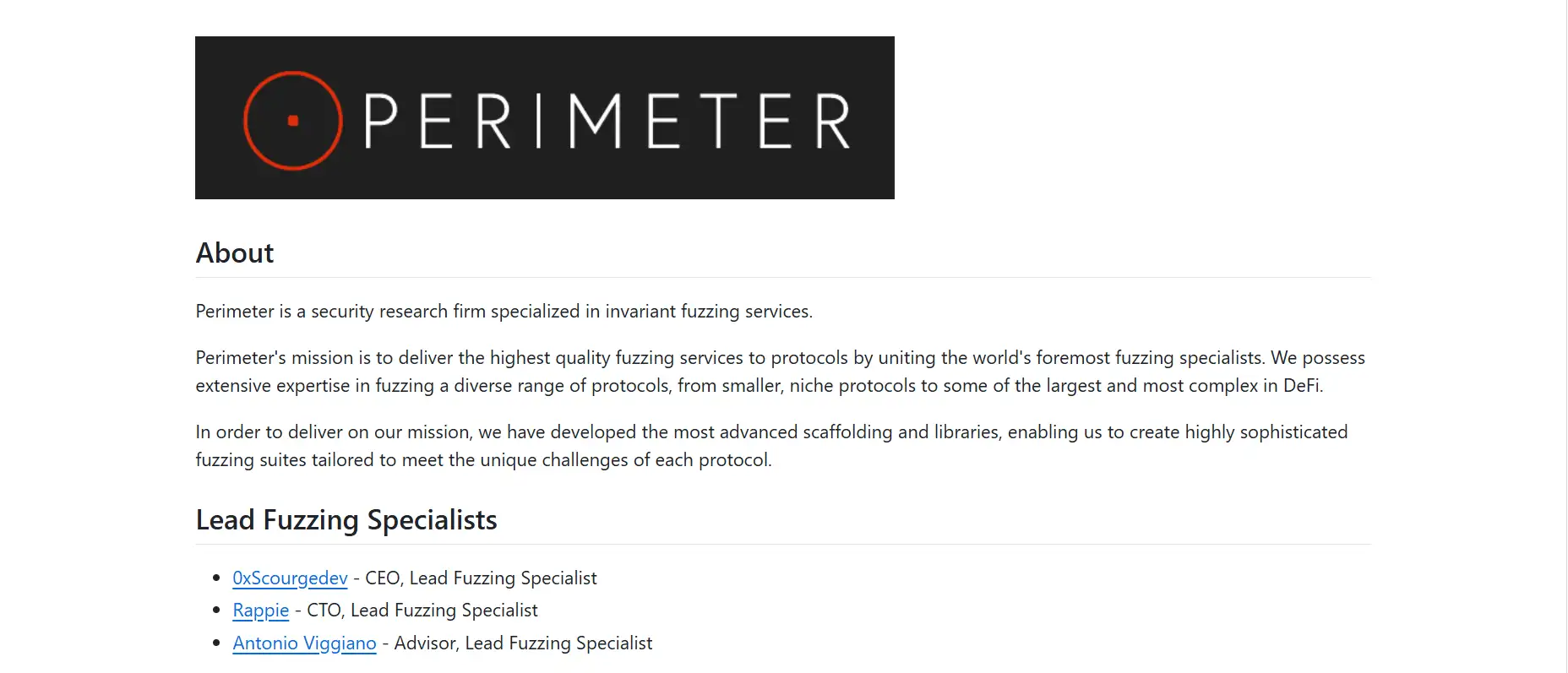 Perimeter is a specialized security research firm focused exclusively on advanced fuzzing services for smart contract protocols. As a guild of world-class fuzzing specialists, Perimeter delivers unparalleled security assurance by designing and executing invariant fuzzing suites that expose vulnerabilities often missed by traditional audits. With a mission to raise the standard of protocol security, the team combines deep protocol expertise with cutting-edge fuzzing techniques to help DeFi and Web3 projects secure their infrastructure.