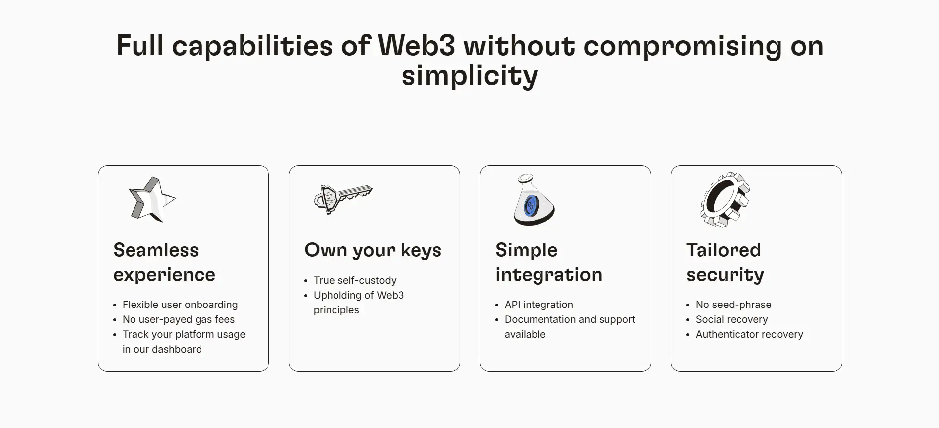 - Progressive Security Layers: Start with simple login and scale to full security with recovery, multisig, and gas payment management as needed.