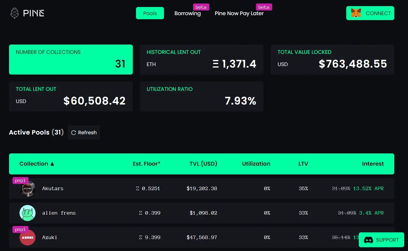 - NFT Collateralization: Pine Loans allows users to leverage their NFTs as collateral to secure loans, unlocking liquidity without selling their assets. This feature provides flexibility and financial freedom for NFT holders.
