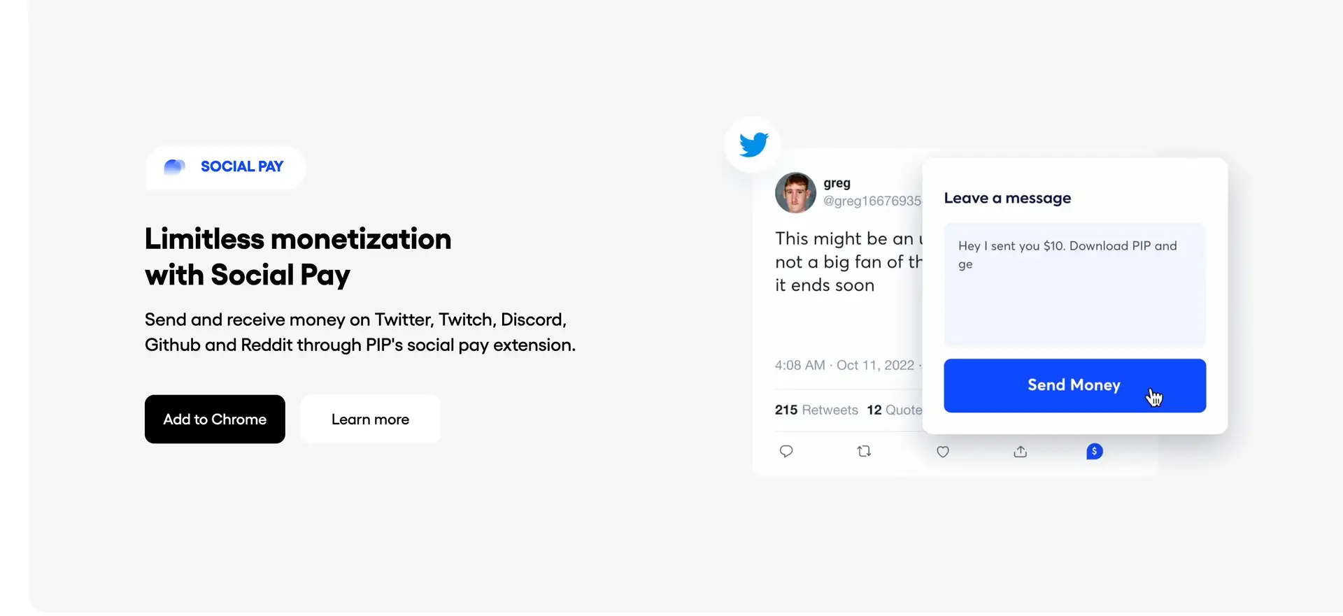 - Social Pay: Allows users to send and receive money on social media platforms like Twitter, Twitch, Discord, GitHub, and Reddit.