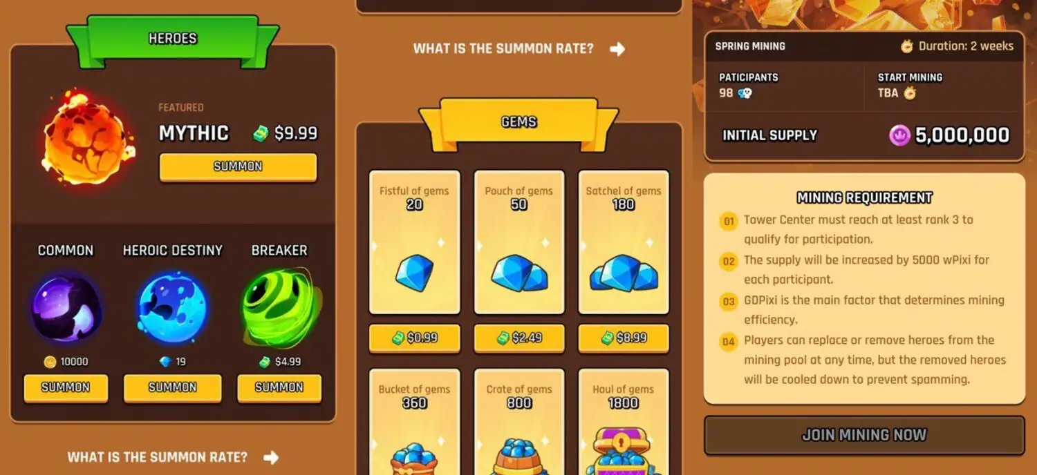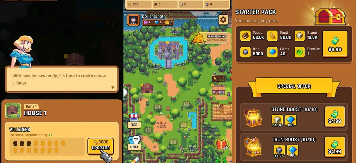 Pixiland combines classic game mechanics with blockchain-powered ownership, creating a dynamic world where every structure, hero, and resource can be earned, upgraded, or traded. At the start of your journey, you’ll manage basic structures like the Town Center, Farms, Sawmills, and Quarries, gathering essential resources such as food, wood, stone, and iron. As your village grows, you’ll unlock strategic buildings like Watchtowers, Dungeons, and the Treasure Chest Island to further expand your power and rewards.