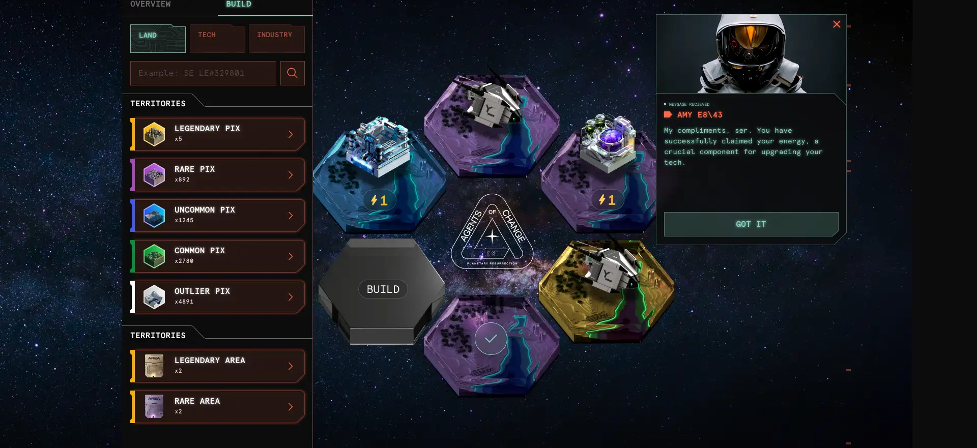 Planet IX leverages blockchain technology to create an immersive play-to-earn experience. Every piece of land and asset within the game is an NFT, providing players with true ownership and the ability to trade on the in-game marketplace, NetEmpire. The primary goal is to collect and connect these land pieces, known as PIX, to form larger territories. Players can stake their territories and other assets to earn IXT, which is integral to the game’s economy.