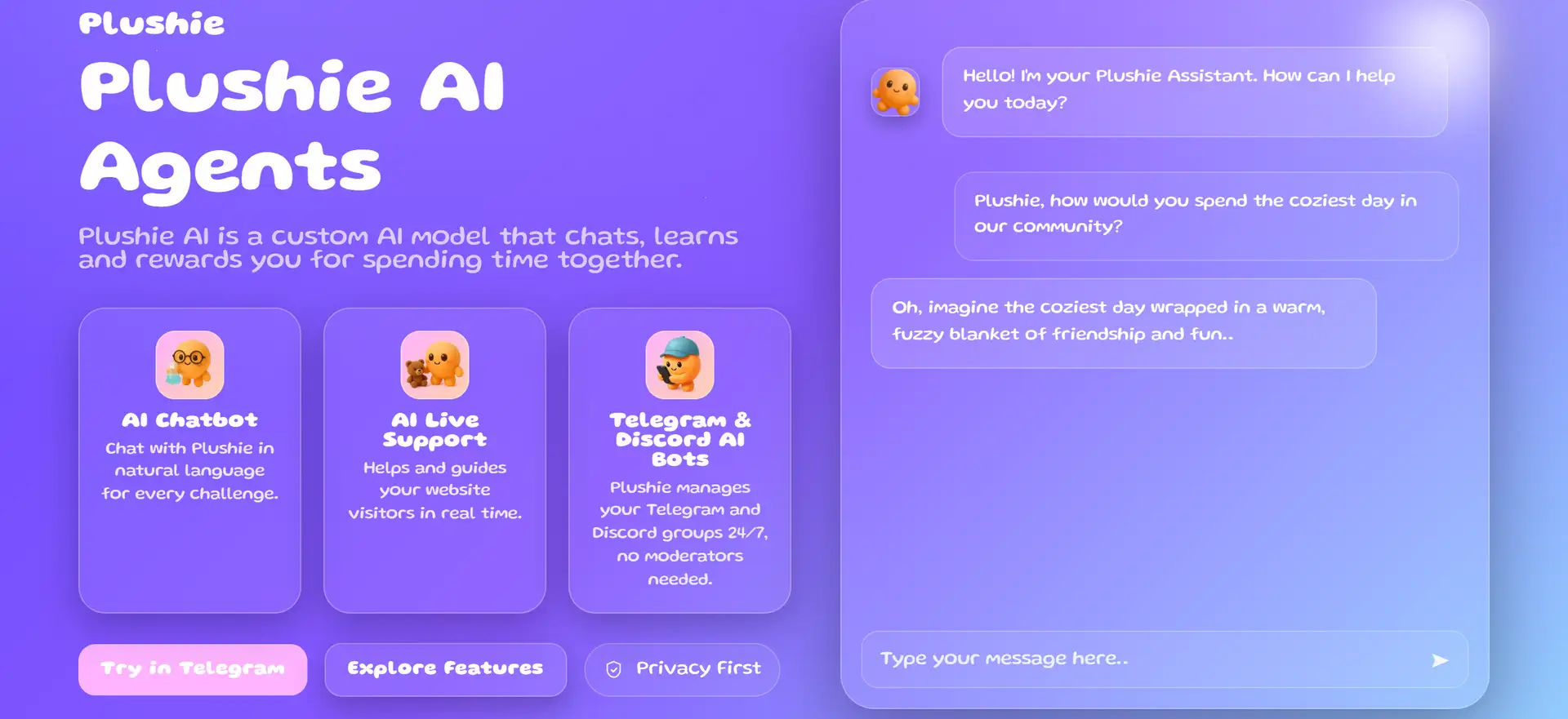 Plushie AI is your cutest AI-Powered Community Companion - a comprehensive Web3-powered ecosystem that encompasses AI-driven community solutions, including AI agents for Telegram & Discord, AI-powered live support systems, and interactive gamified experiences.