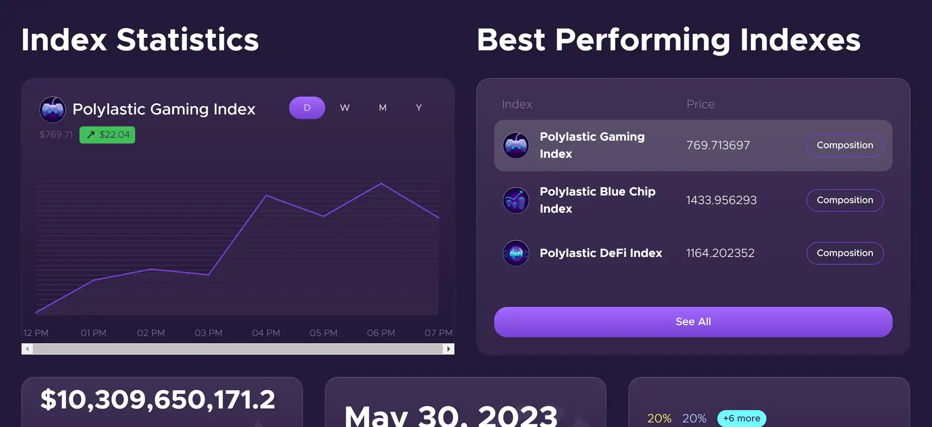 The main purpose of the Polylastic platform is to simplify crypto portfolio management by offering a set of digital asset indexes. These indexes provide diversified exposure to various segments of the digital finance industry, allowing users to invest in a broad spectrum of assets through a single token.