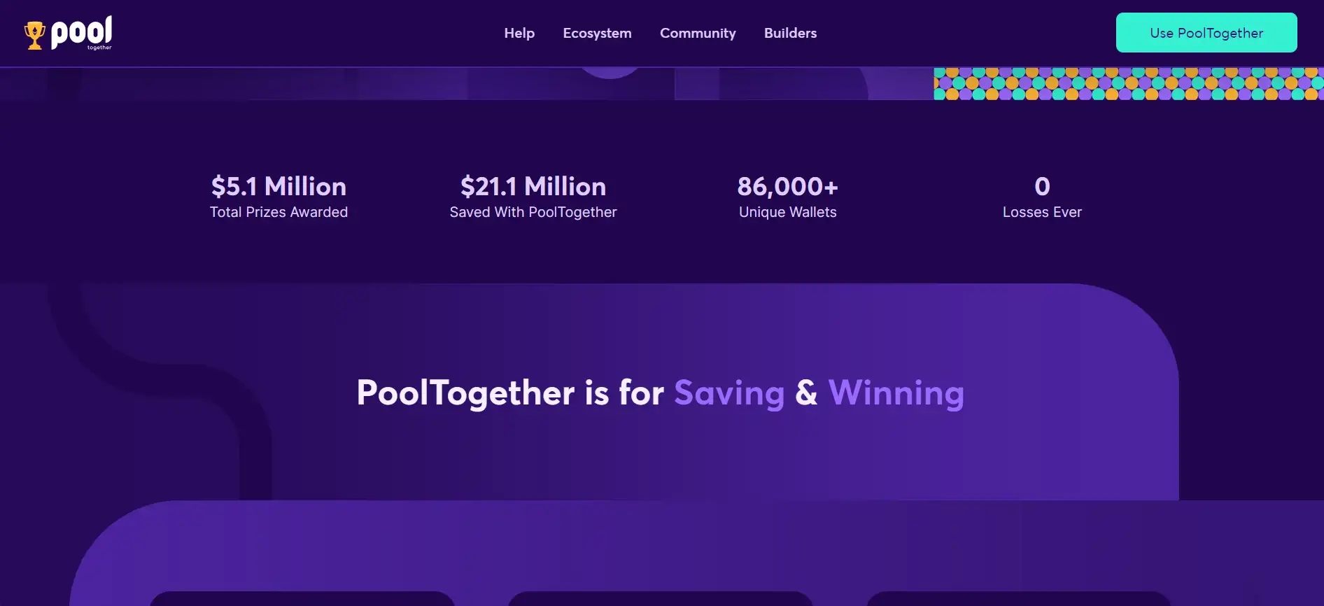 The platform operates through decentralized smart contracts, ensuring transparency and security for all participants. Deposits generate yield, and instead of individual interest payments, all the yield is pooled together to create larger prize draws. This makes PoolTogether a compelling alternative to traditional savings accounts and lottery systems. Learn more at PoolTogether.
