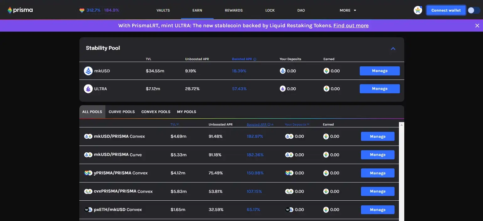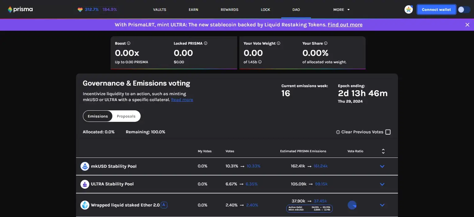 - Participate in Governance: To influence the future of the protocol, acquire ULTRA tokens and participate in governance decisions through the Prisma DAO. Stake your tokens to increase your voting power and earn boosted rewards.