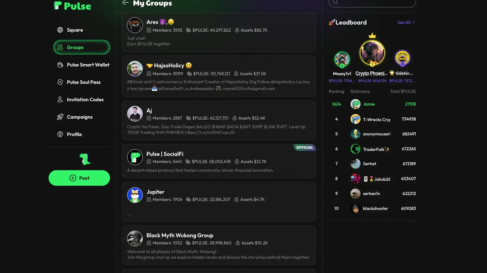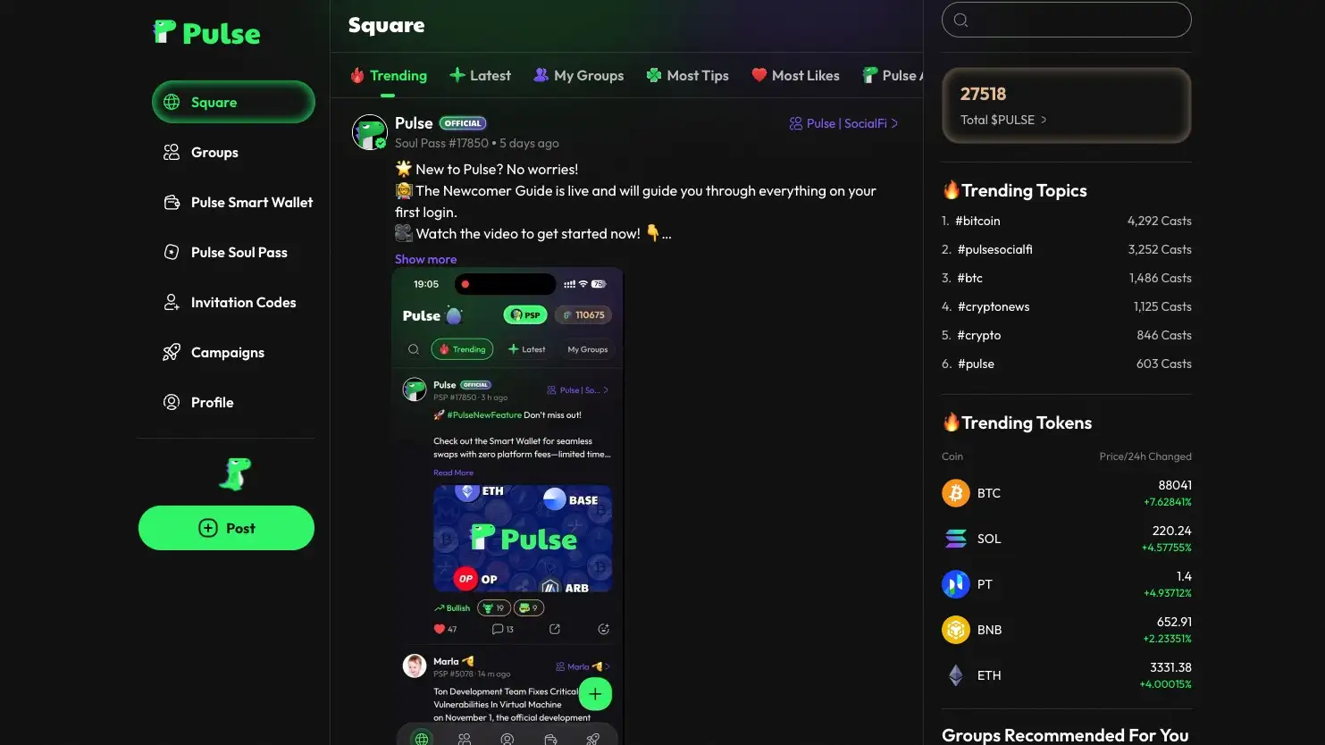 Pulse is a comprehensive Web3 SocialFi platform that has revolutionized the crypto trading and social engagement space. Founded with the aim to bridge the gap between trading, insights, and community interactions, Pulse has grown into a hub for cryptocurrency enthusiasts. It combines social features such as posts, live chats, and community groups with trading functionalities, creating a unified ecosystem for users to engage, learn, and trade.