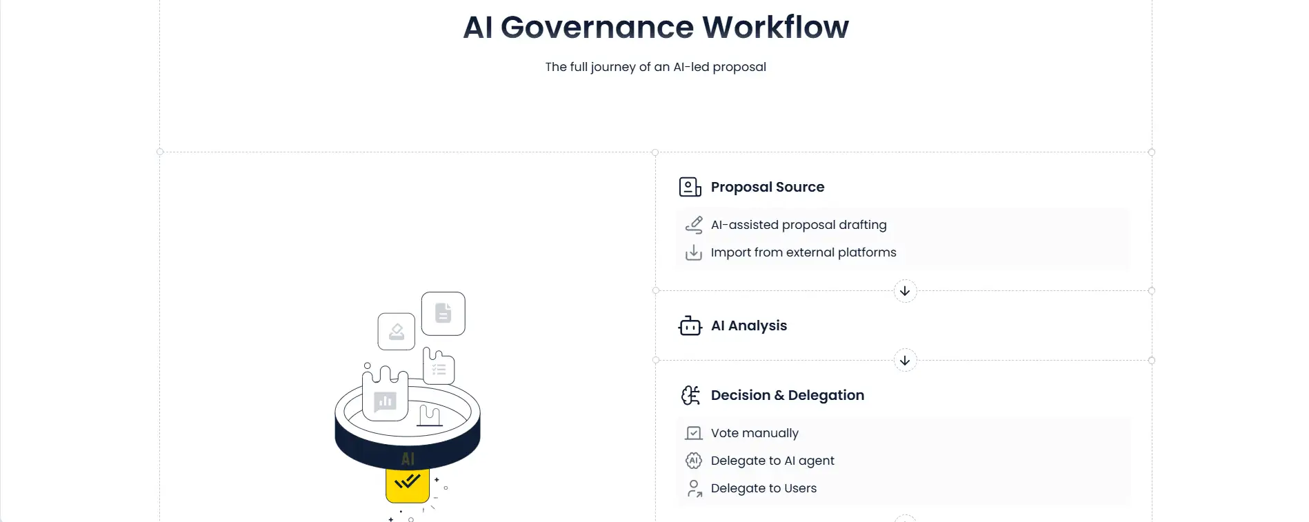 - Delegate or Create an AI Agent: Select an AI governance agent that aligns with your values, or create a new programmable agent to handle decisions on your behalf.