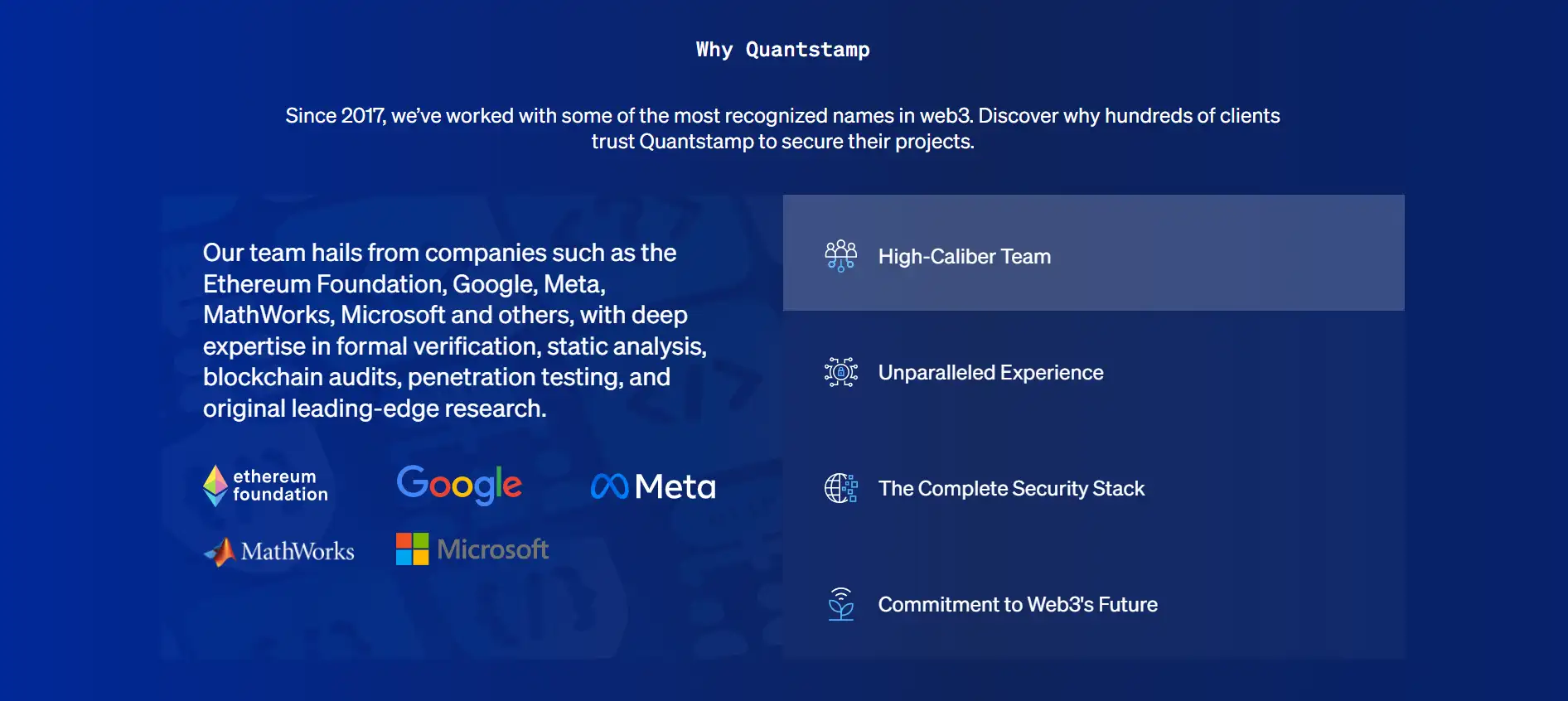 Quantstamp is a globally recognized blockchain security provider specializing in smart contract auditing, Web3 infrastructure reviews, and security automation. Since launching in 2017, the company has protected over $200 billion in digital assets and conducted more than 1,100 audits across 60+ blockchain ecosystems. By working with industry leaders like Polygon, Solana, OpenSea, Compound, and Axie Infinity, Quantstamp has earned a reputation as a premier security partner in the evolving Web3 space.