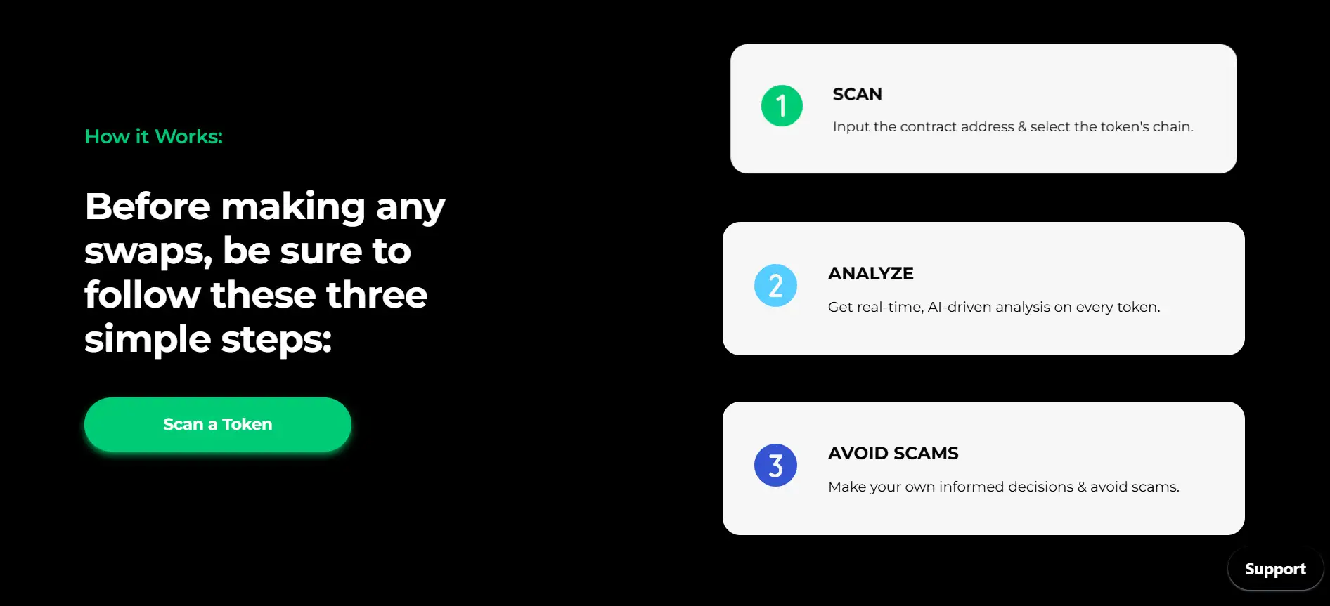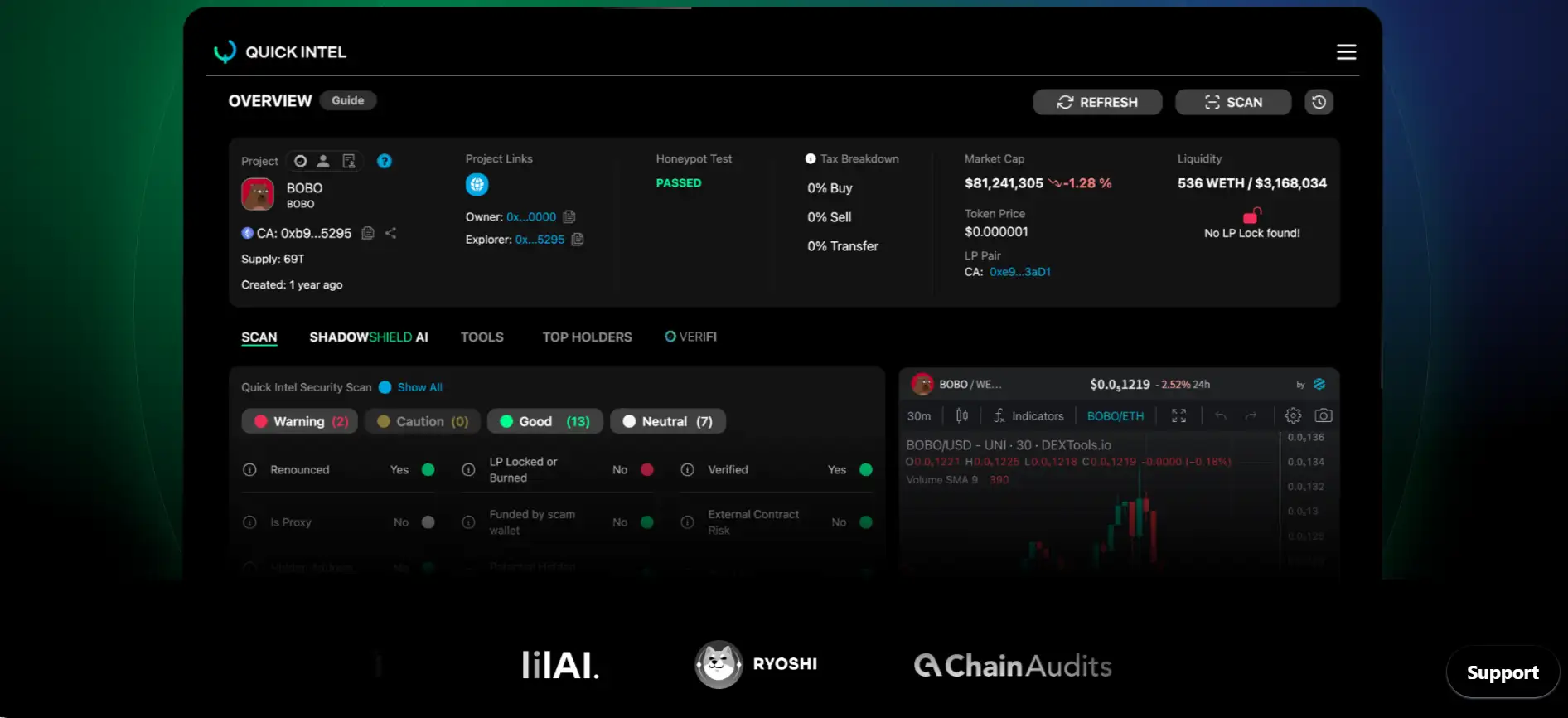 - Real-Time Token Scanning: Users can scan any contract address and receive immediate insights on potential threats, malicious code, and high-risk functions.