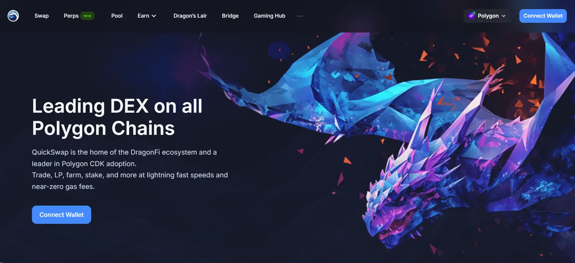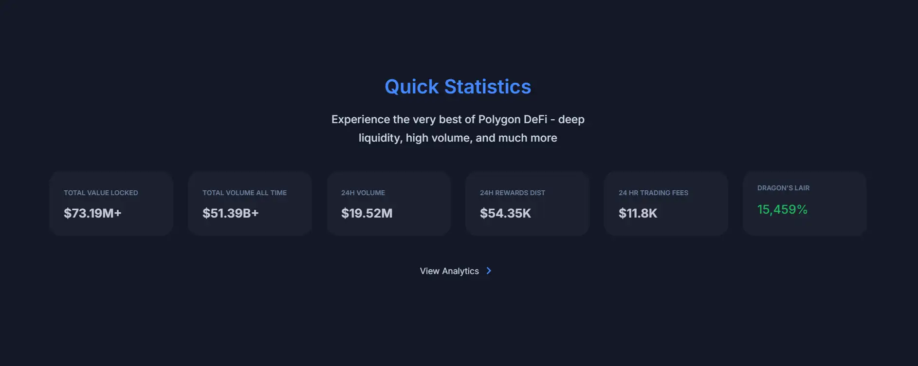 - Dragon’s Lair Staking: Users can stake the QuickSwap governance token to earn additional yield through the platform’s unique staking mechanism.