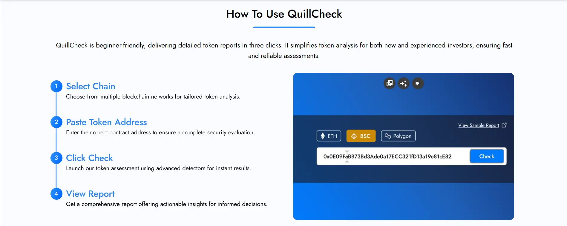 QuillCheck is an AI-powered token analysis platform designed to safeguard DeFi users by detecting honeypots, analyzing token risks, and delivering fast, accurate smart contract insights. Backed by the WachAI engine and integrated with the QuillAI Network, QuillCheck empowers users with real-time intelligence across multiple blockchains including Ethereum, BSC, Polygon, Base, and Solana.