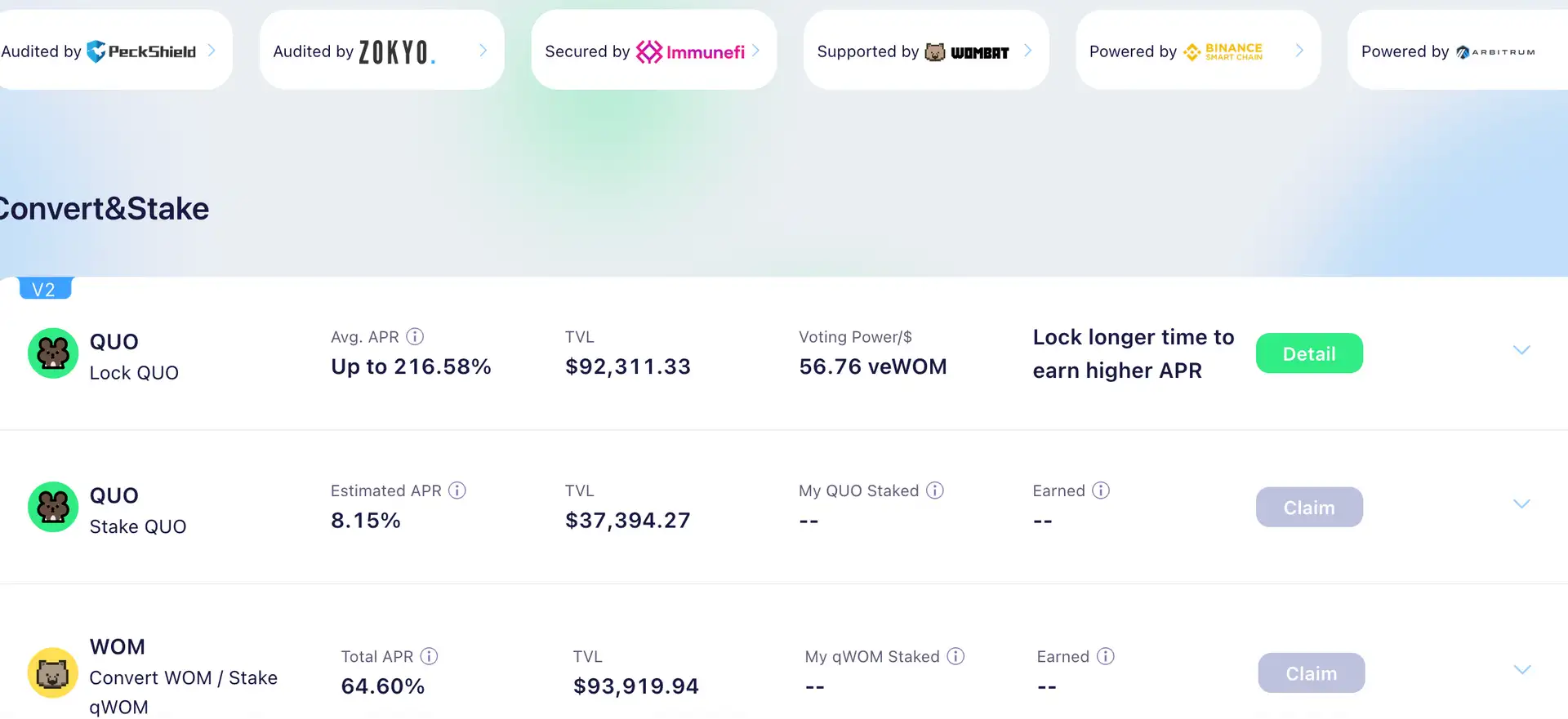 - Integration with Wombat Exchange: This integration allows Quoll Finance to leverage the liquidity and user base of Wombat Exchange, providing its users with enhanced yield farming opportunities.