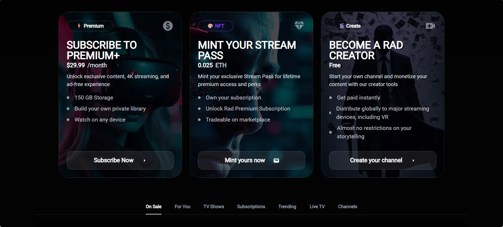 - Become a Creator: Click “Become a Rad Creator” to launch your own channel, upload content, and monetize with NFTs and instant payments.