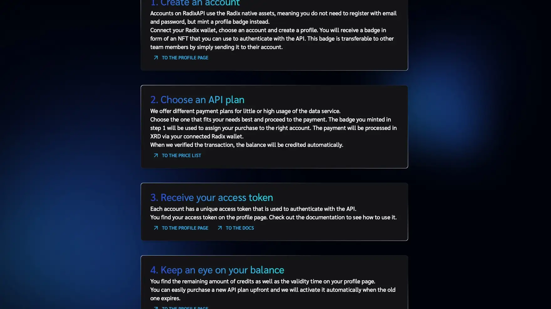 - Monitor your usage and plan details on your profile to ensure uninterrupted access to RadixAPI services.