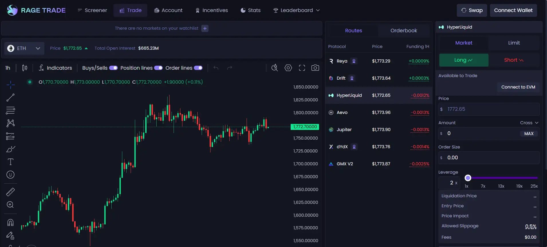 Rage Trade acts as a powerful liquidity aggregator for perpetual futures, bringing together fragmented liquidity from different decentralized exchanges (DEXes) and networks into one unified interface. By offering aggregated routing, traders can always secure the best execution by accessing the best price, lowest fees, optimal funding rates, and even token incentives—all through a familiar CEX-like trading UI. Whether trading on Arbitrum, Optimism, or specialized appchains like Hyperliquid and Aevo, users can manage everything from a single dashboard.