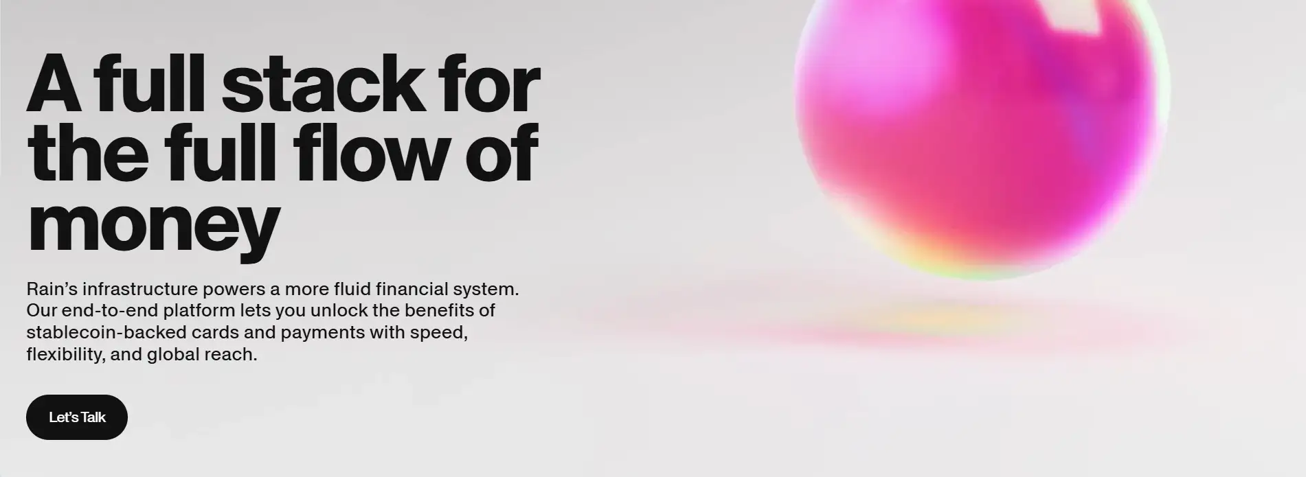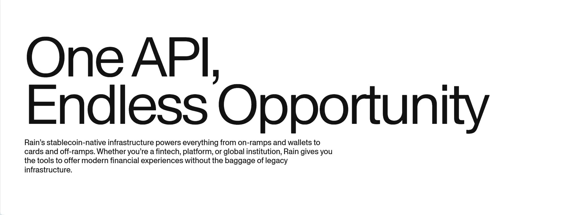 Rain is a stablecoin-native platform offering a complete financial stack for businesses and developers to launch real-world payment and banking products using digital assets. At its core, Rain offers end-to-end infrastructure that simplifies everything from card issuance to on/off-ramps, wallets, and cross-border payments. Instead of patching outdated financial systems, Rain is building entirely new pipelines for a programmable, global economy.