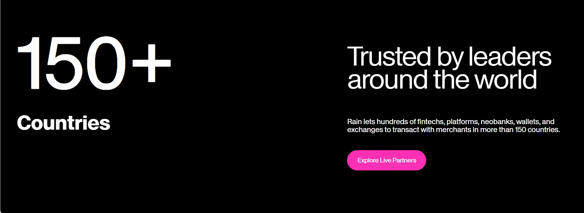 Rain is trusted by neobanks, exchanges, fintechs, and platforms in over 150 countries. Its modular, compliant, and developer-first infrastructure is already being used to power stablecoin-linked card programs, global B2B payments, and instant crypto-to-fiat off-ramps. Rain helps financial builders move fast, stay compliant, and deliver seamless user experiences—all while rewriting the rails of the global money movement system.