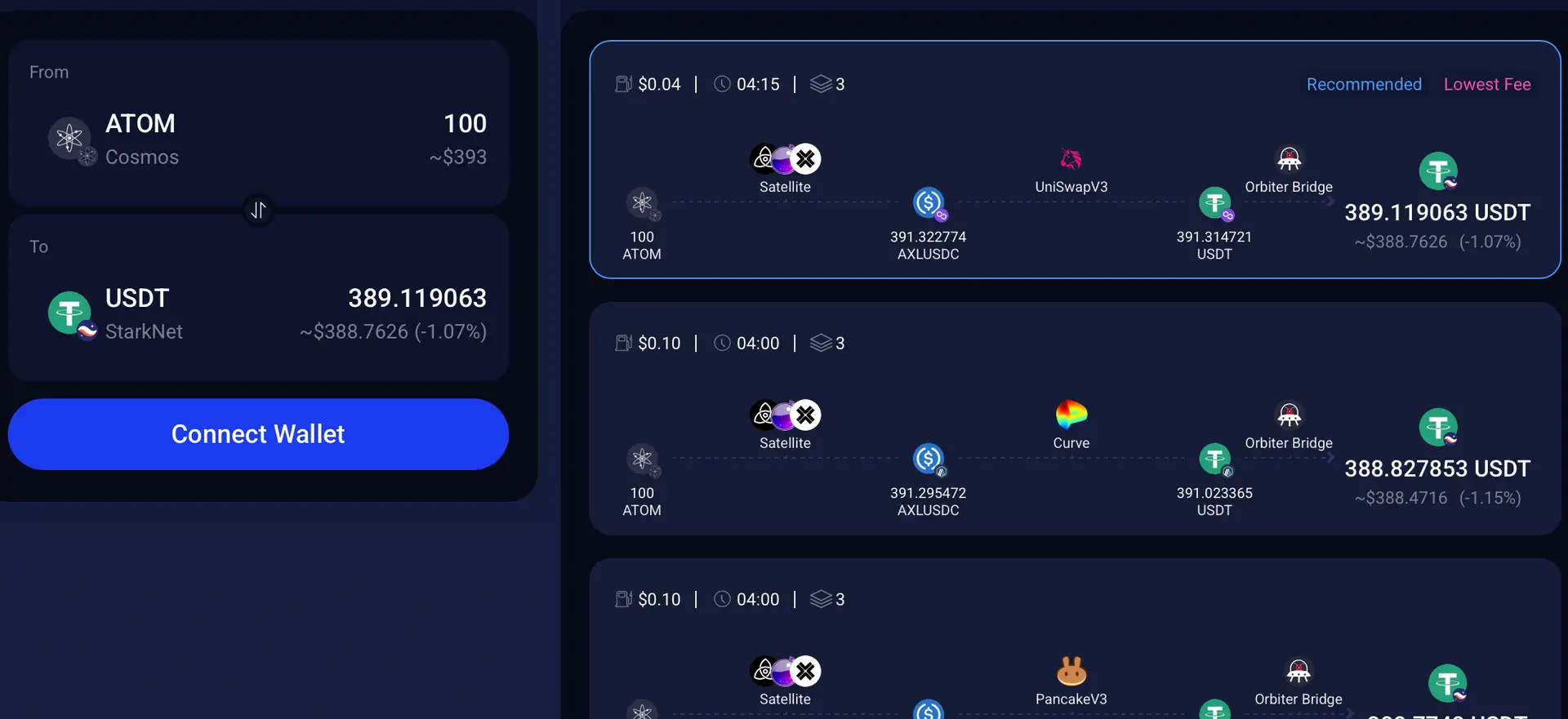 - Multi-Ecosystem Coverage: Aggregates across EVM, Cosmos, Solana, Starknet, Tron, Bitcoin, and UTXO chains.