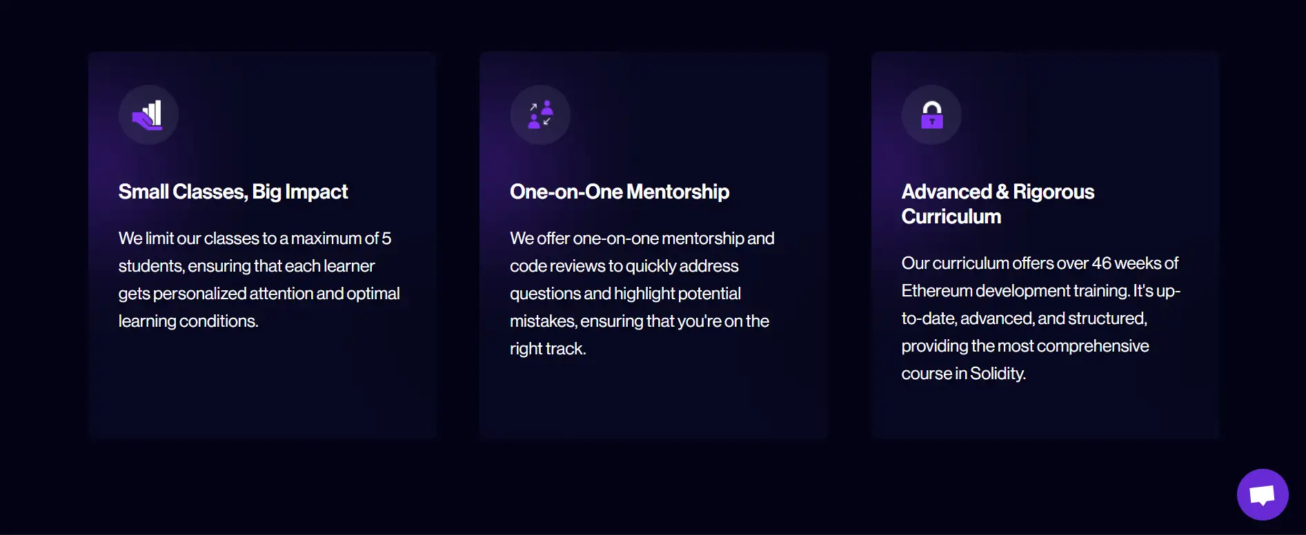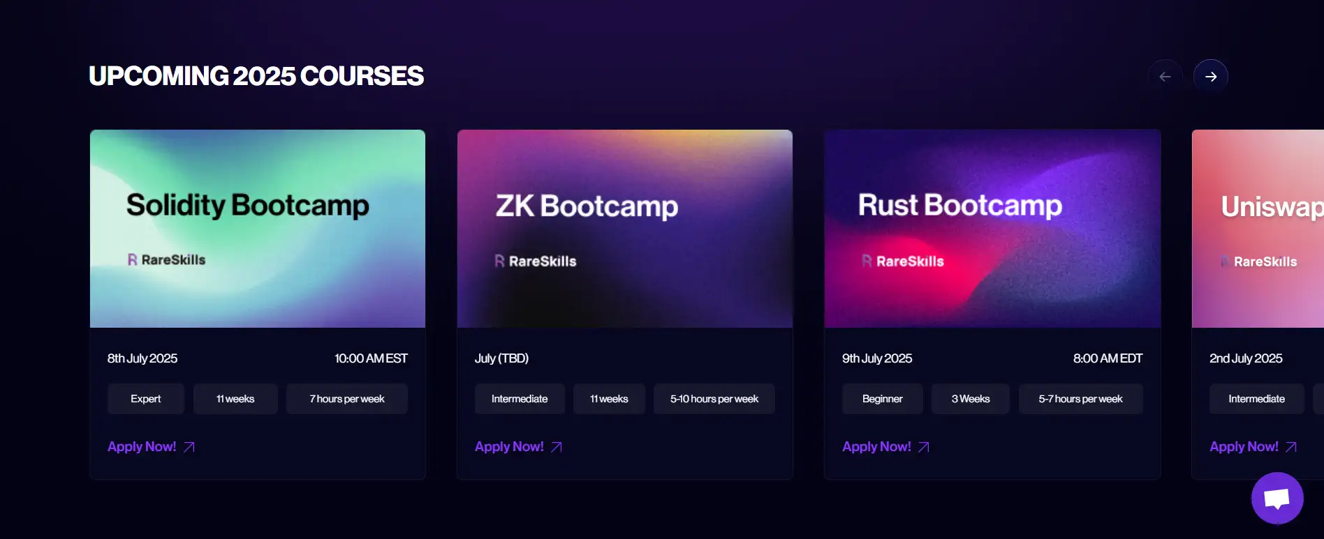 - Advanced Curriculum: Courses go far beyond beginner-level material, with bootcamps in Solidity, Zero Knowledge Proofs, Uniswap V3, Rust, and Circom.
