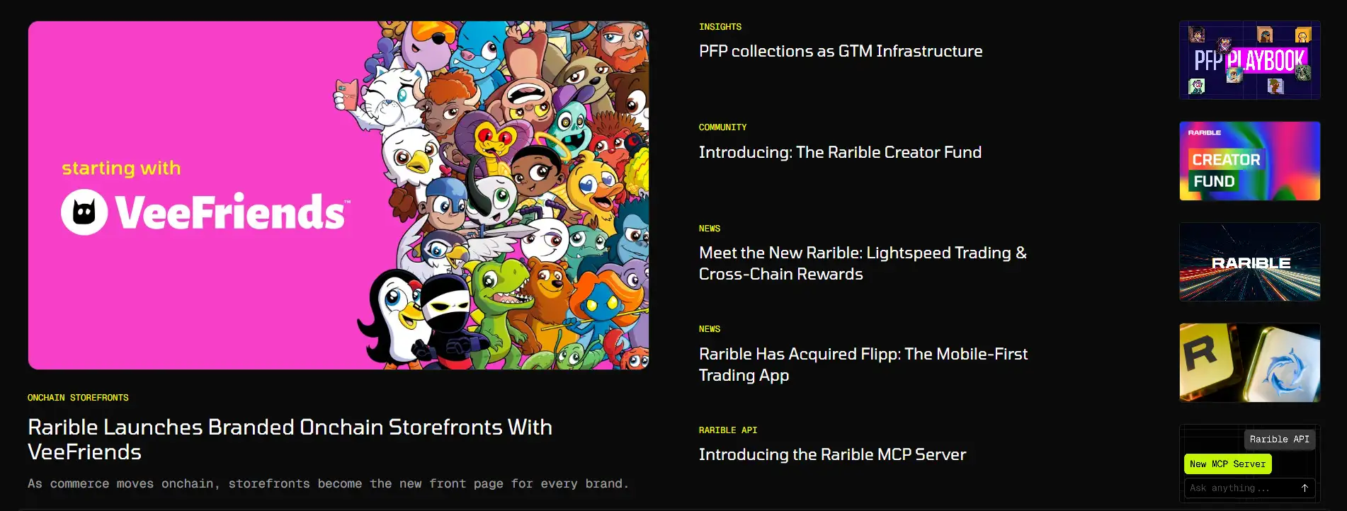 In addition to traditional marketplace functionality, Rarible has introduced features like branded onchain storefronts, where IP-based collections such as VeeFriends can create fully customizable, self-sovereign NFT hubs. These storefronts represent a shift toward onchain commerce, aligning with the evolving trend of digital ownership and decentralized brand engagement.