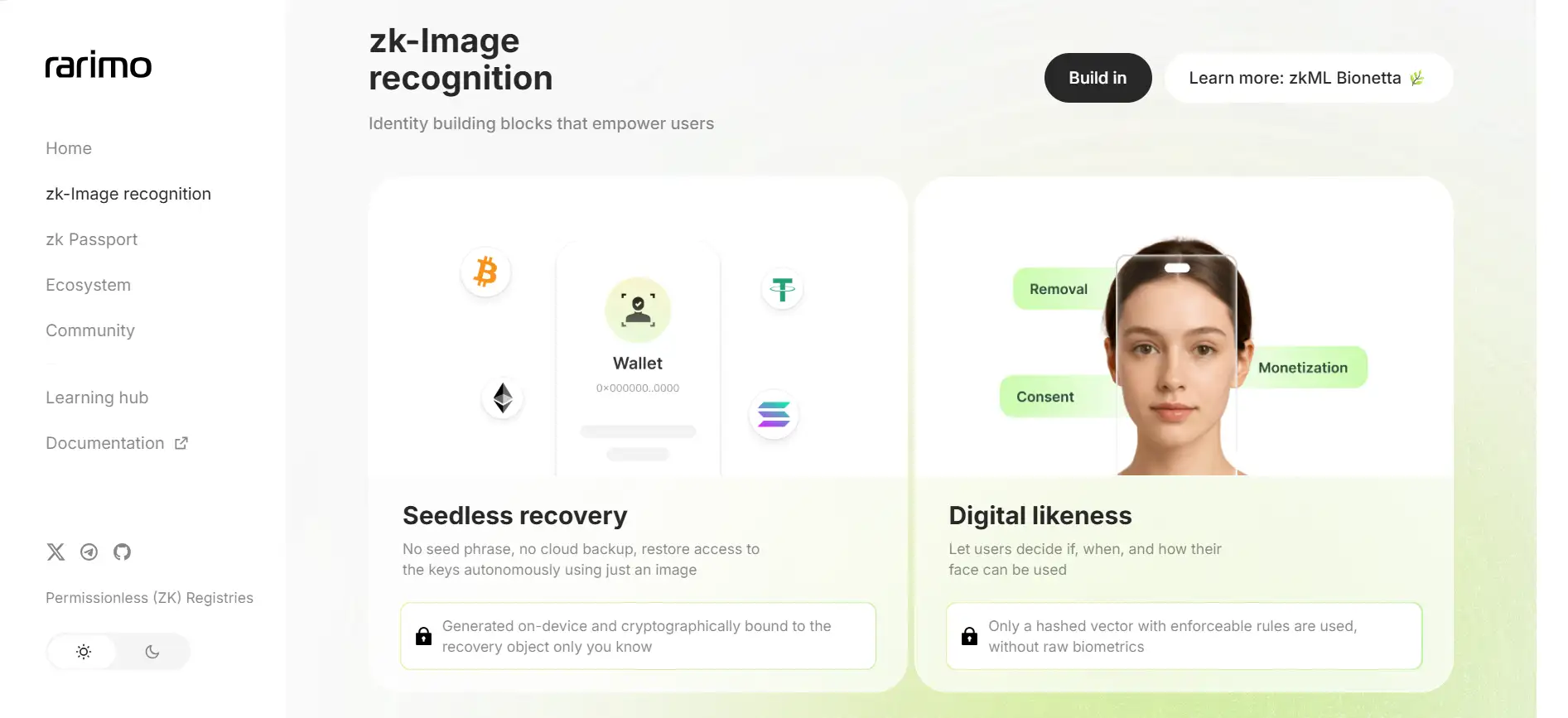 Through its innovative seedless recovery protocol, Rarimo allows users to recover access to their crypto wallets without traditional seed phrases or backups. Using encrypted on-device image recognition and zk-ML proofs, Rarimo binds wallet recovery to a cryptographic image that only the user controls. No external server or cloud is involved, meaning no personal data can be leaked or stolen. This solution, available through RariMe, offers true self-custody without the vulnerabilities of password or seed storage.