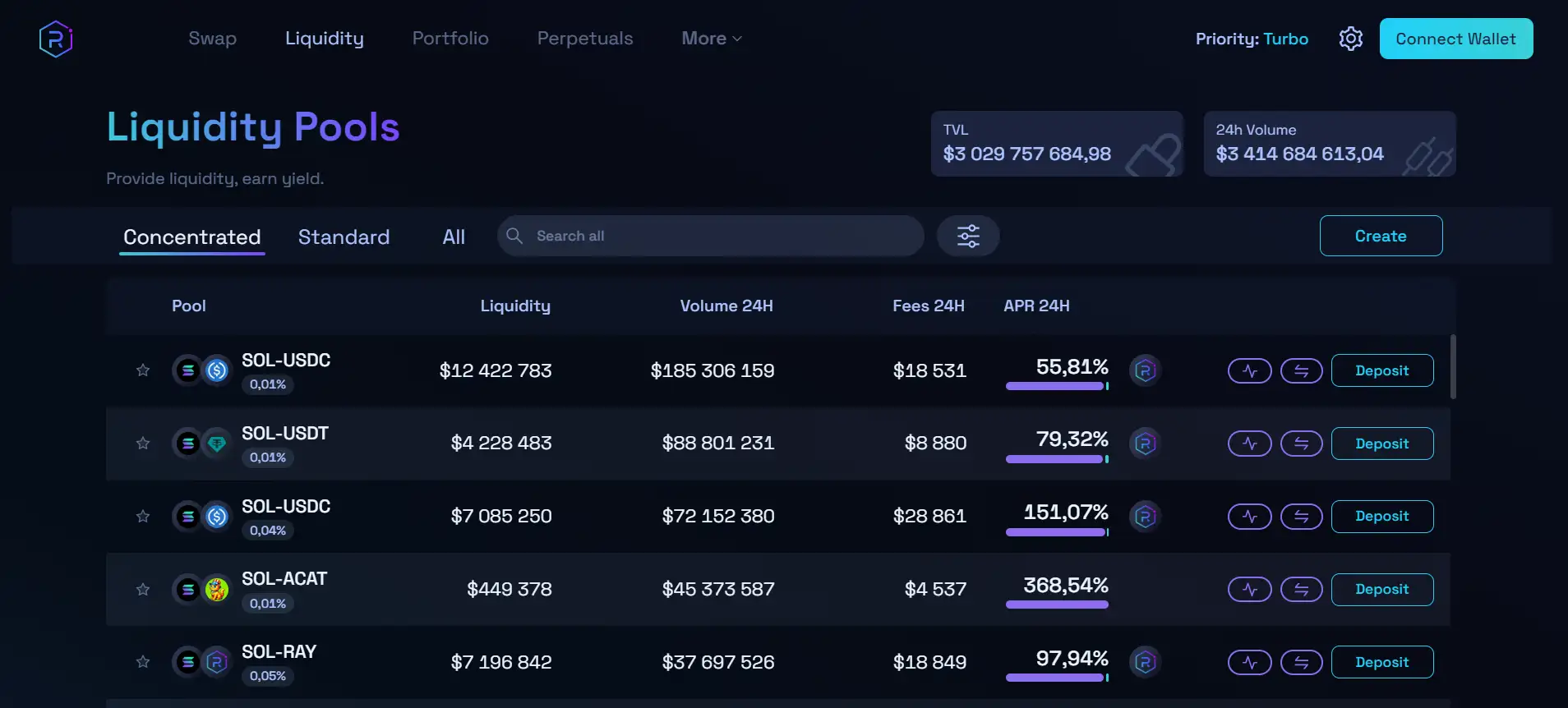 - Yield Farming: Users can provide liquidity to various pools and earn RAY token rewards.